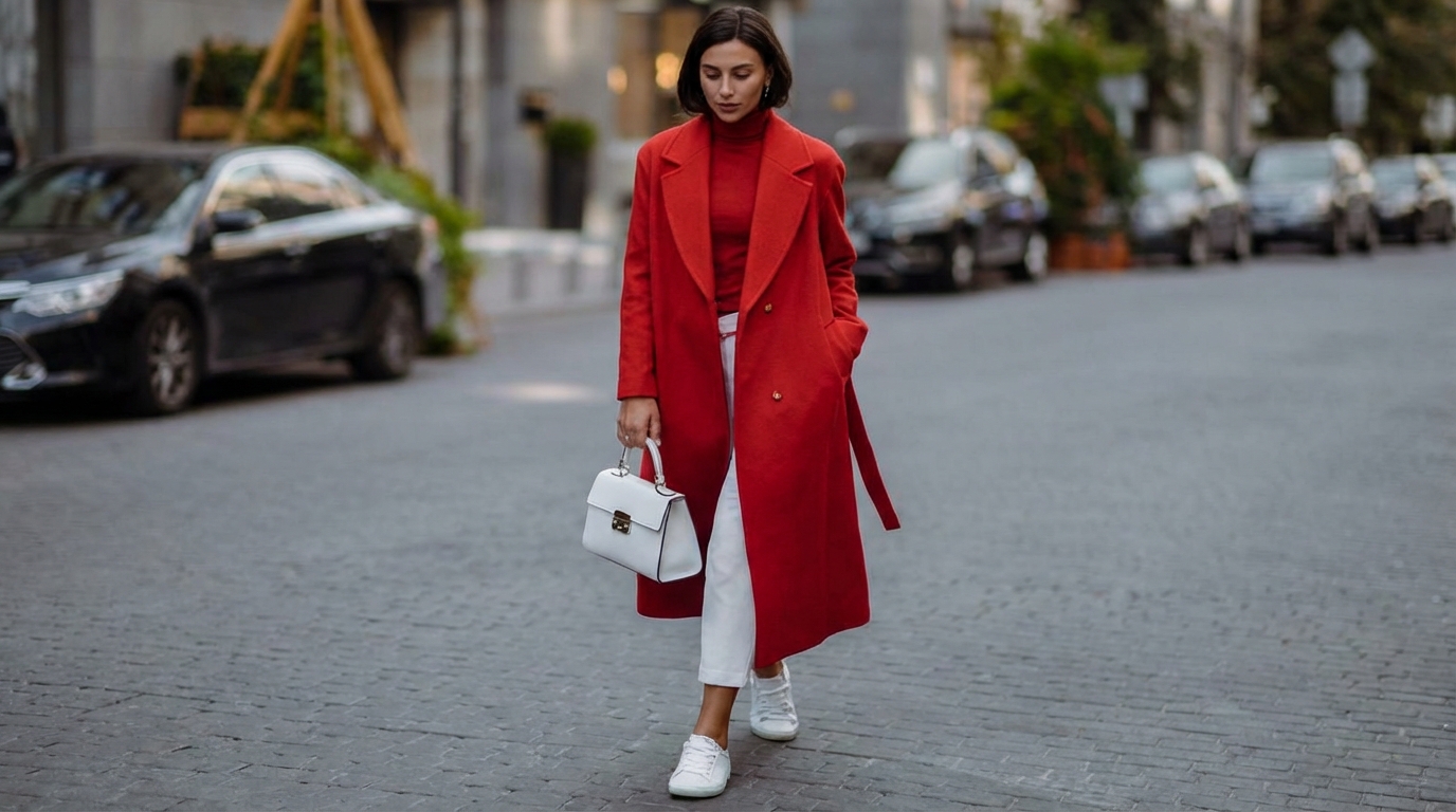 Červený kabát skvěle vypadá s celočerným outfitem, s džíny a bílým trikem. Dodá i tomu nejjednoduššímu oděvu sílu. Stylově ladit bude také například s červeným svetrem nebo pastelovými šaty. Červený kabát si bude rozumět s béžovou či pastelově růžovou kabelkou. Hezky ladit bude i s temně zelenou kabelkou.