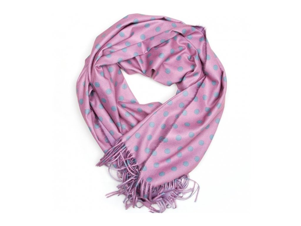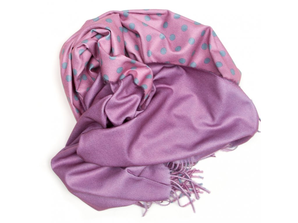 Dámská oboustranná šála s motivem puntíků v růžovo-zelené kombinaci barev zakončená střapci. Jednu stranu šály zdobí motiv zelených puntíků, druhá strana je bez motivu v jasně růžové barvě. Šála je hřejivá a příjemná na dotyk.