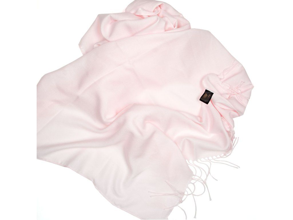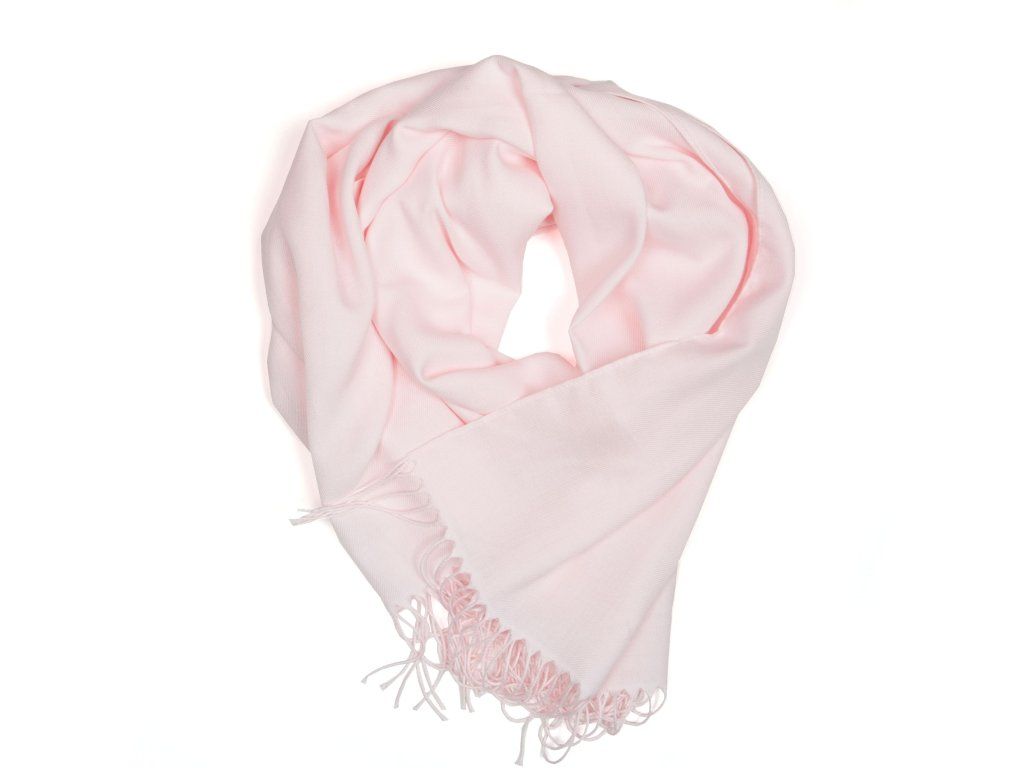 Dámská pašmínová šála ve světle růžové barvě zdobená dlouhými střapci.