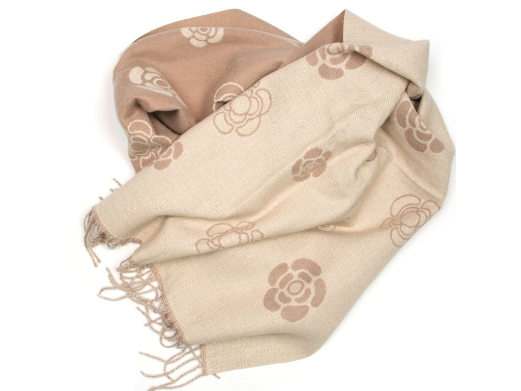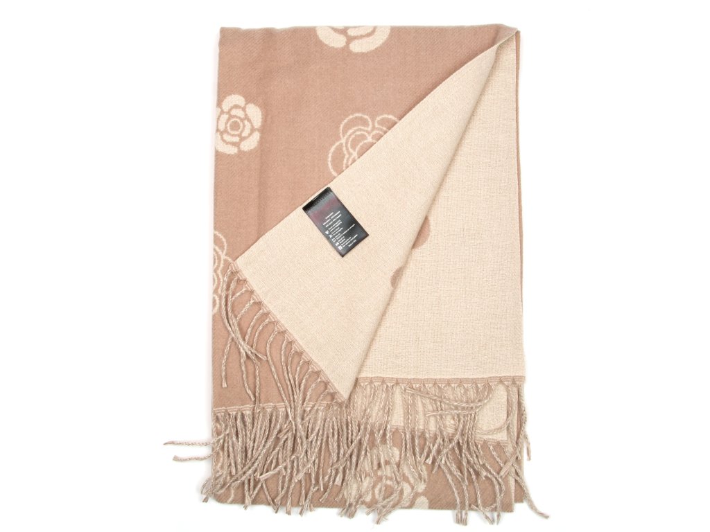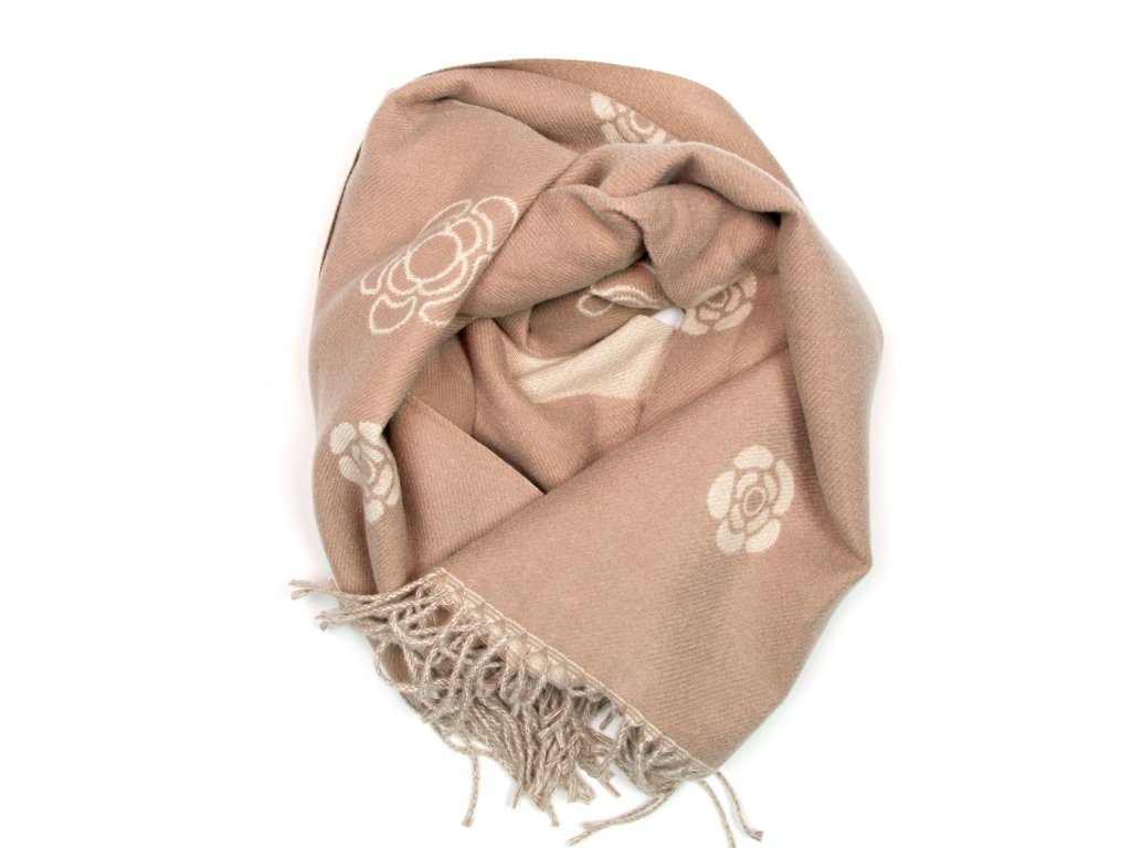 Dámská šála v béžové barvě zakončená jemnými střapci je elegantním doplňkem, který se hodí ke každému outfitu. Je hřejivá, měkká a příjemná na dotek. Motiv dodává šále osobitý styl a ženský půvab.