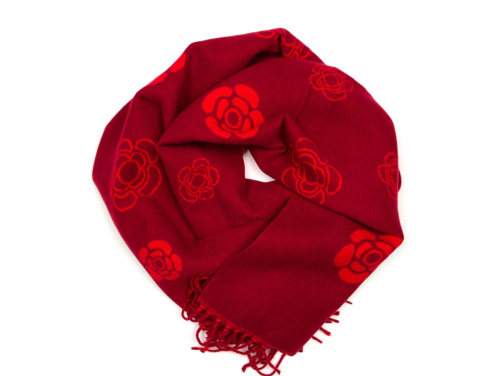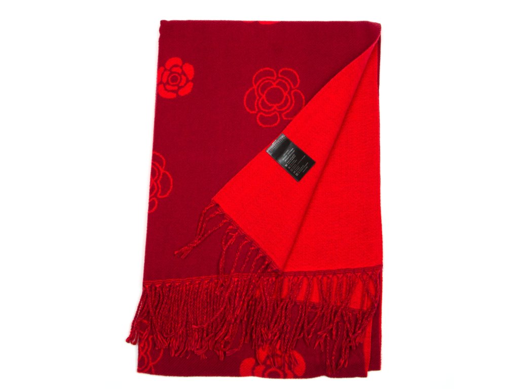 Dámská šála v červené barvě zakončená jemnými střapci je elegantním doplňkem, který se hodí ke každému outfitu. Je hřejivá, měkká a příjemná na dotek. Motiv dodává šále osobitý styl a ženský půvab.
