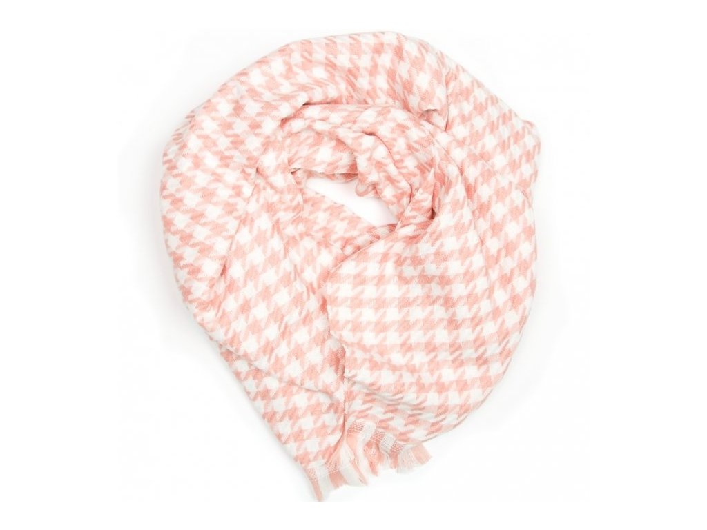 Dámská šála s módním vzorem kohoutí stopy zakončená krátkými střapci v béžovo-růžové kombinaci. Šála je nadýchaná, hřejivá a příjemná na dotyk.