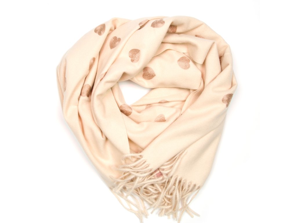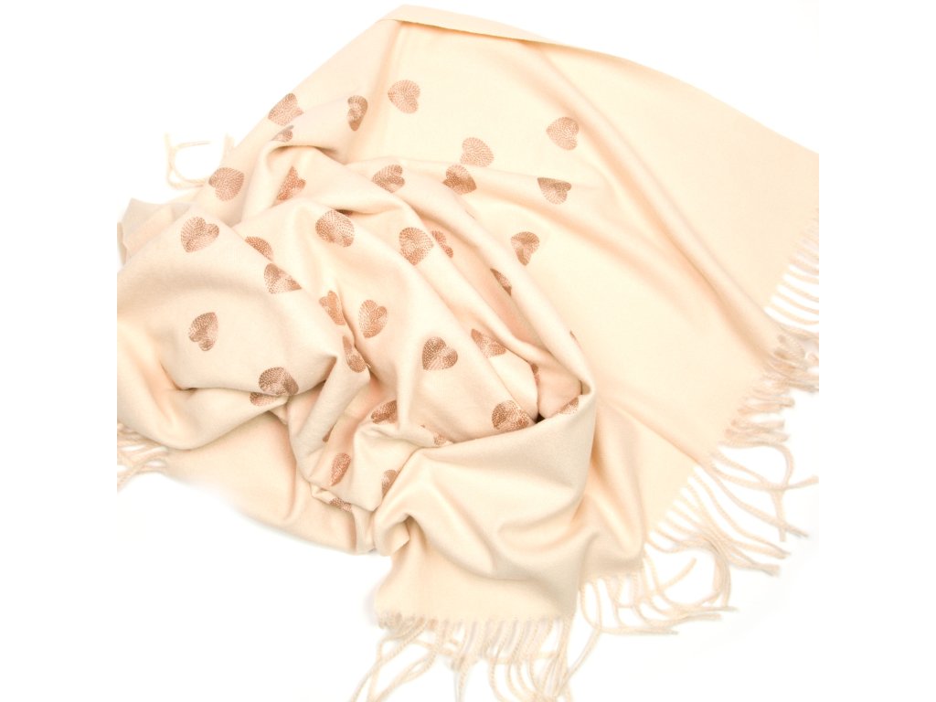 Béžová šála s motivem vyšitých srdíček je důkazem, že i doplněk může mít duši. Jemné střapce a měkký, hřejivý materiál z ní dělají ideální volbu pro dny, kdy chcete spojit eleganci s něžností.