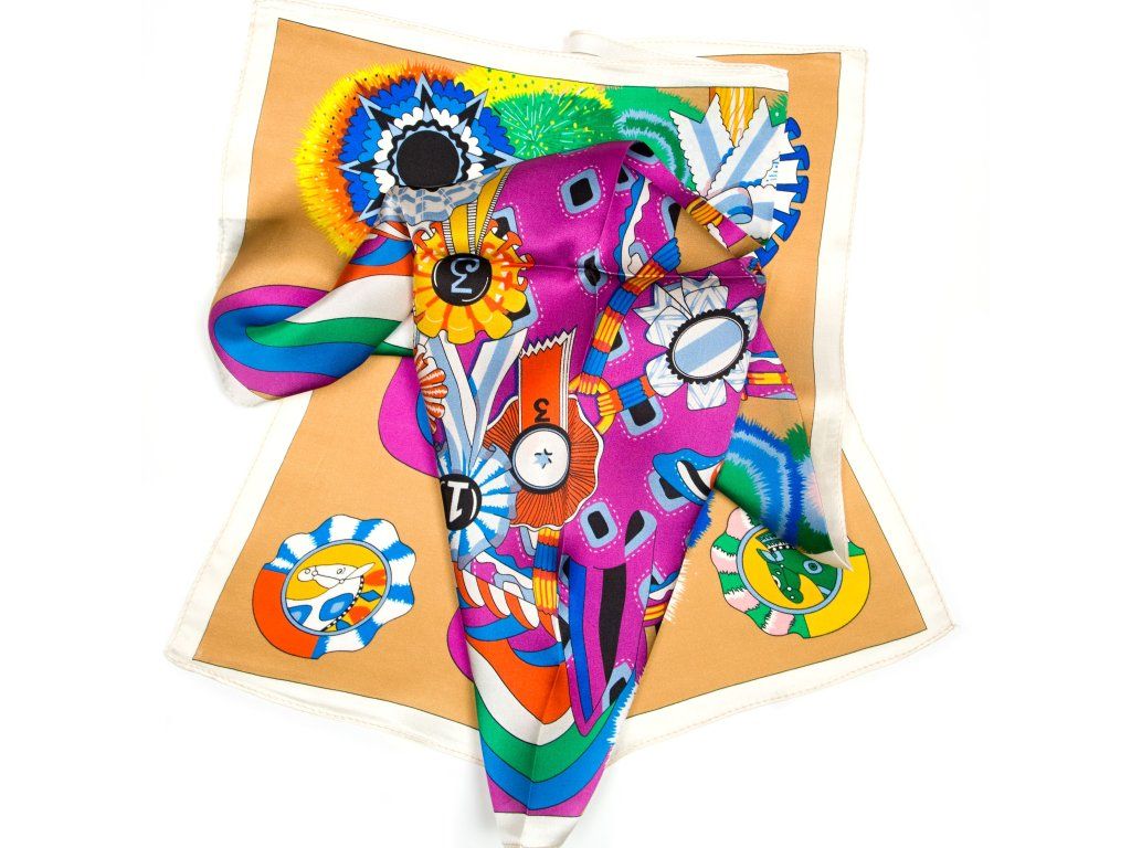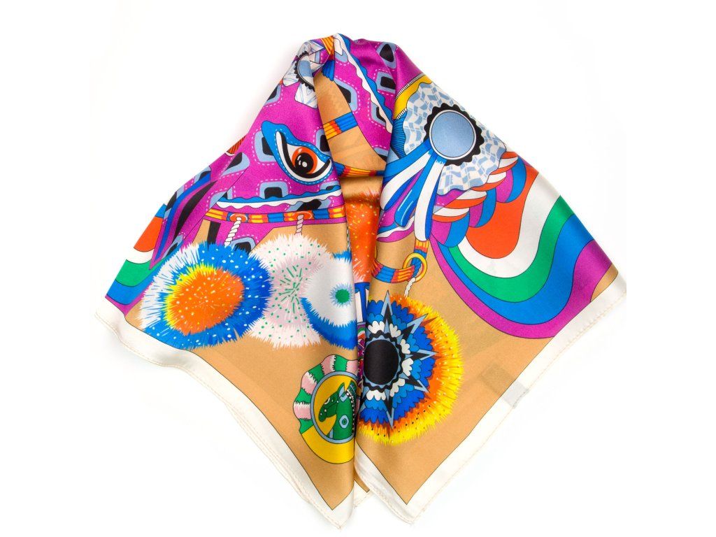 Dámský hedvábný šátek v multicolor barvě s motivem. Šátek je možné nosit klasicky na krku, skvěle však bude vypadat i na kabelce či ve vlasech.
