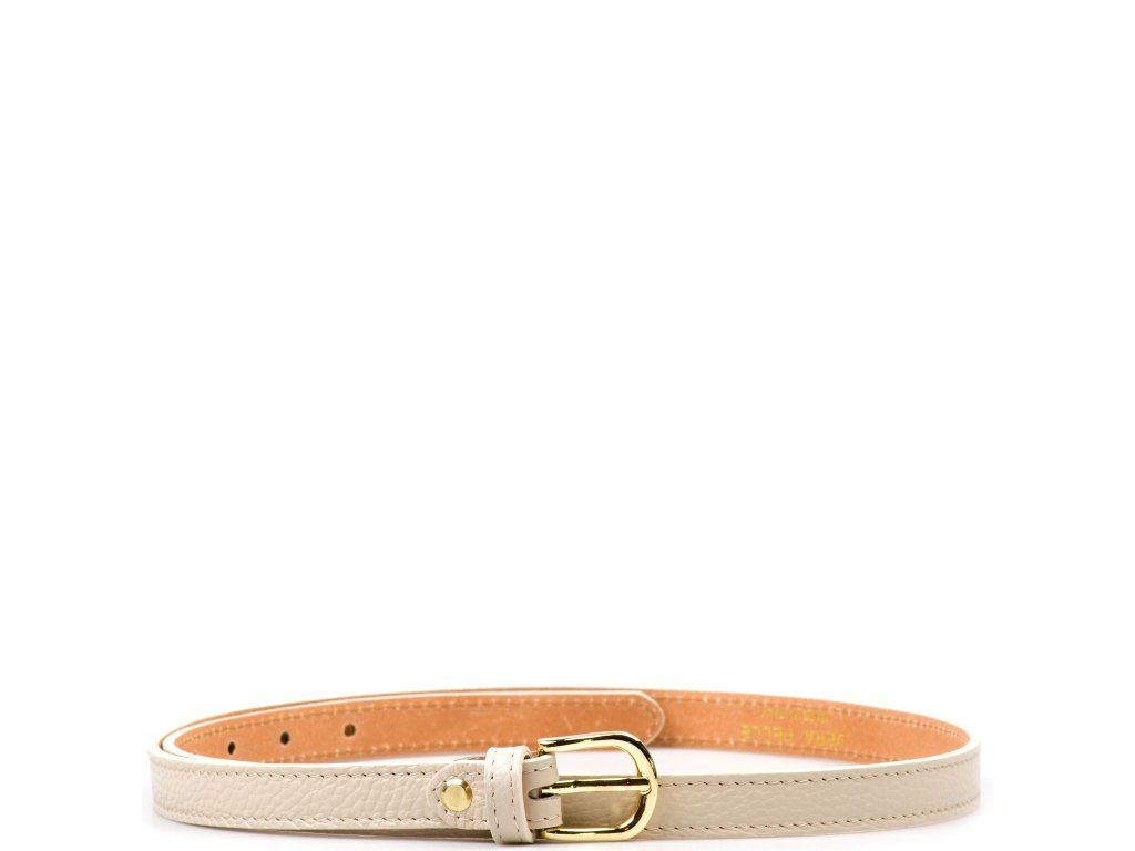 Dámský kožený opasek v béžové barvě. Opasek má sponu ve zlaté barvě. Délku pásku lze jednoduše upravit povolením nýtu se šroubkem.