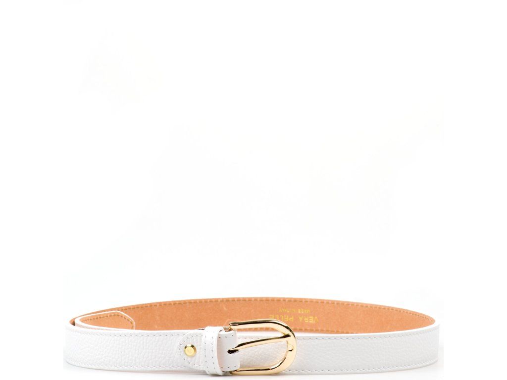 Dámský široký kožený opasek v bílé barvě. Opasek má lesklou sponu ve zlaté barvě. Délku pásku lze jednoduše upravit povolením nýtu se šroubkem.