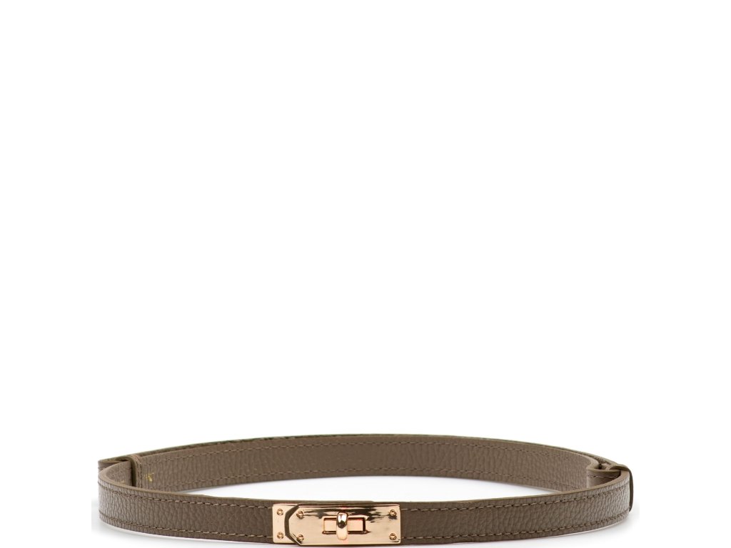 Dámský kožený opasek ve fango barvě. Opasek má sponu ve zlaté barvě. Opasek je skvělý k doplnění outfitu. Opasek se posouvá dle využití.