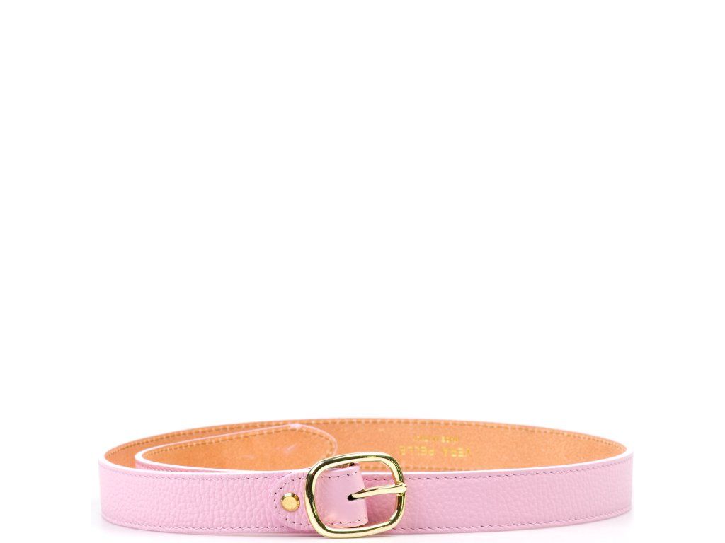 Dámský kožený opasek v růžové barvě. Opasek má sponu ve zlaté barvě. Délku pásku lze jednoduše upravit povolením nýtu se šroubkem.
