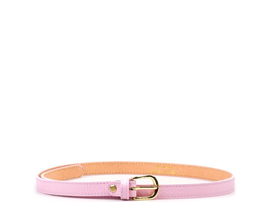 Dámský kožený opasek v růžové barvě. Opasek má sponu ve zlaté barvě. Délku pásku lze jednoduše upravit povolením nýtu se šroubkem.