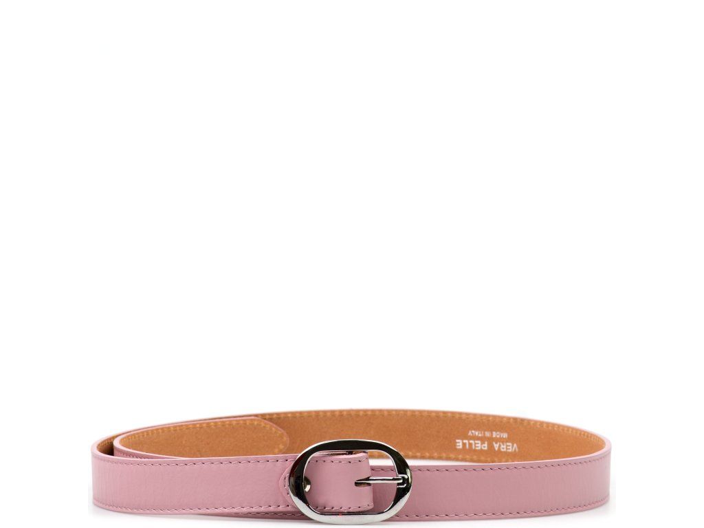 Dámský kožený opasek v růžová barvě. Opasek má lesklou sponu ve stříbrné barvě. Délku pásku lze jednoduše upravit.