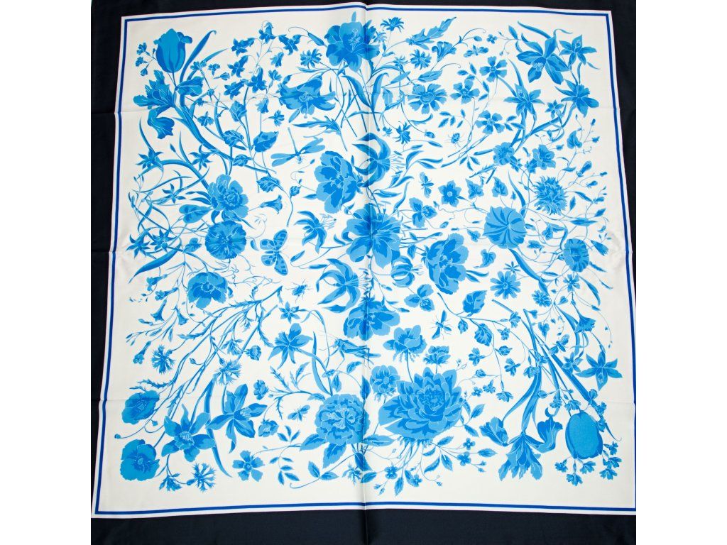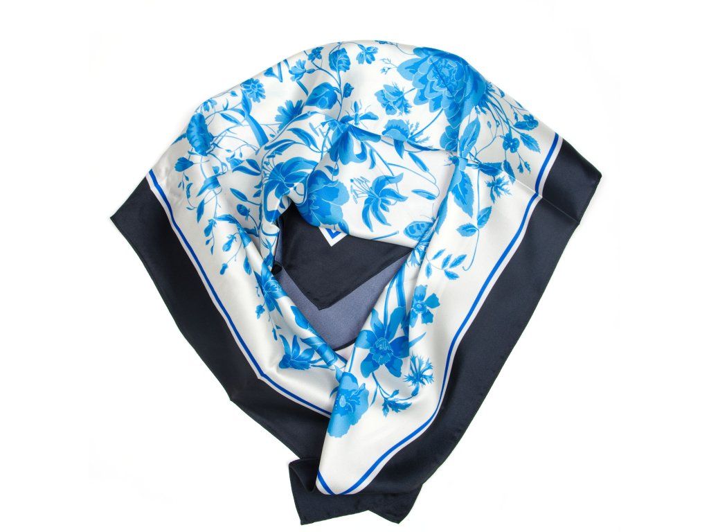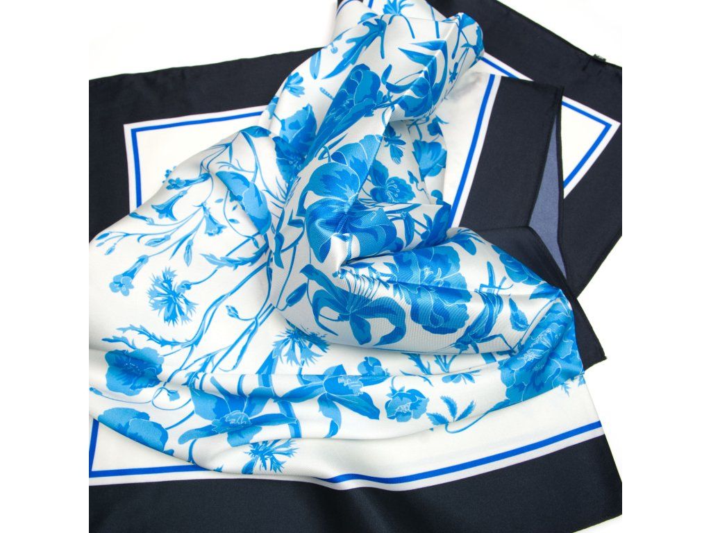 Dámský šátek v modré barvě s motivem. Šátek je možné nosit klasicky na krku, skvěle však bude vypadat i na kabelce či ve vlasech.