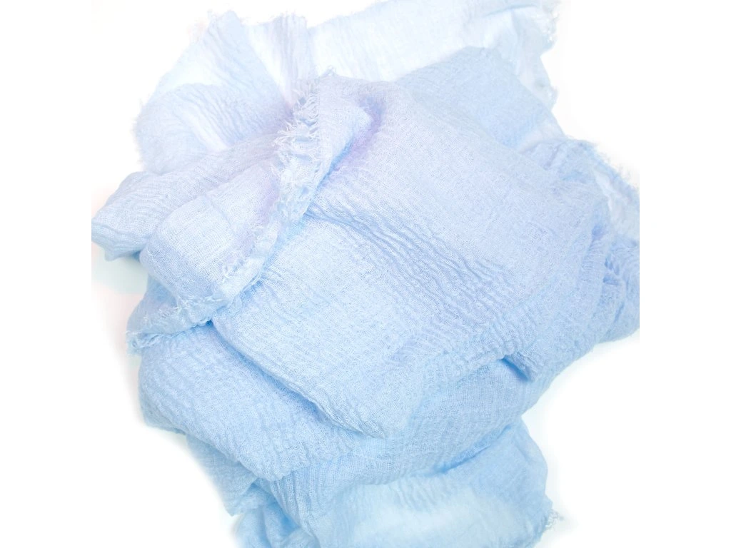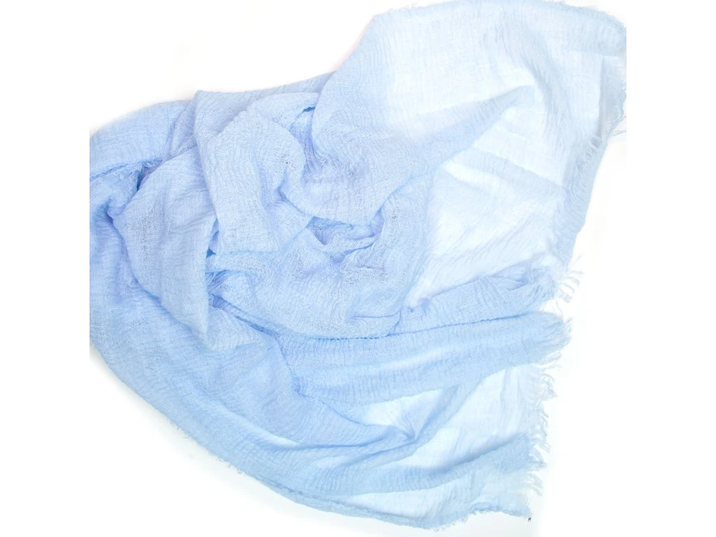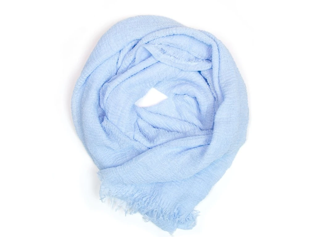 Lehký dámský šátek ve světle modré barvě. Šátek je po obvodu zdobený krátkými střapci. Šátek může sloužit jako pléd na letní večery i společenské události.
