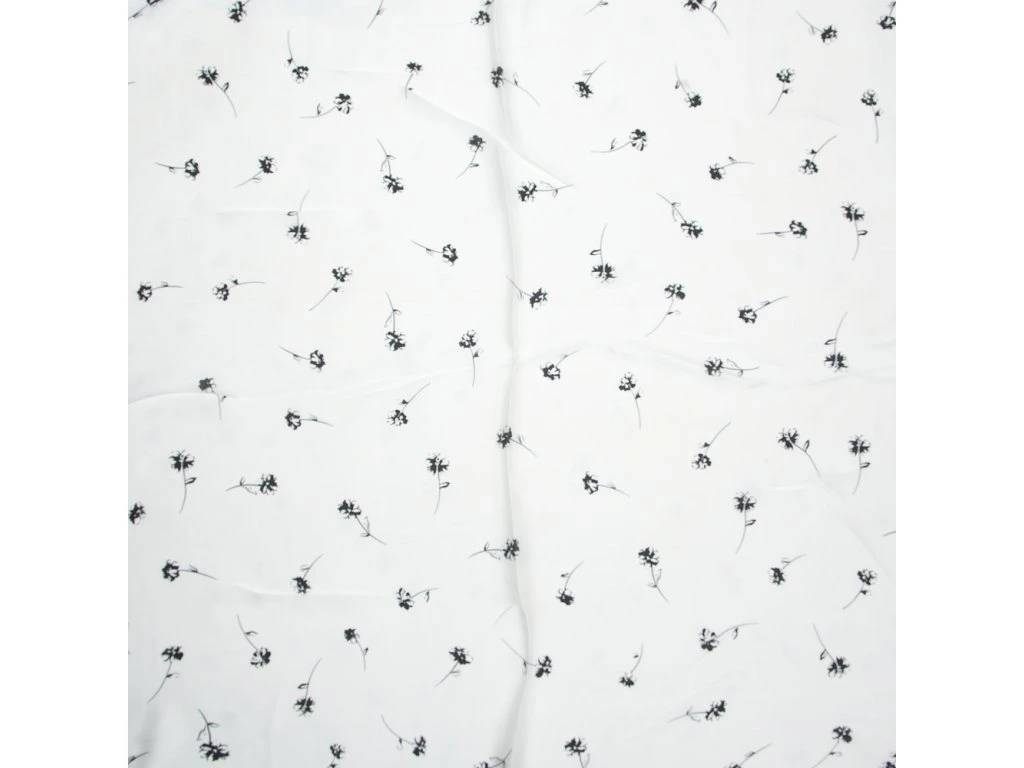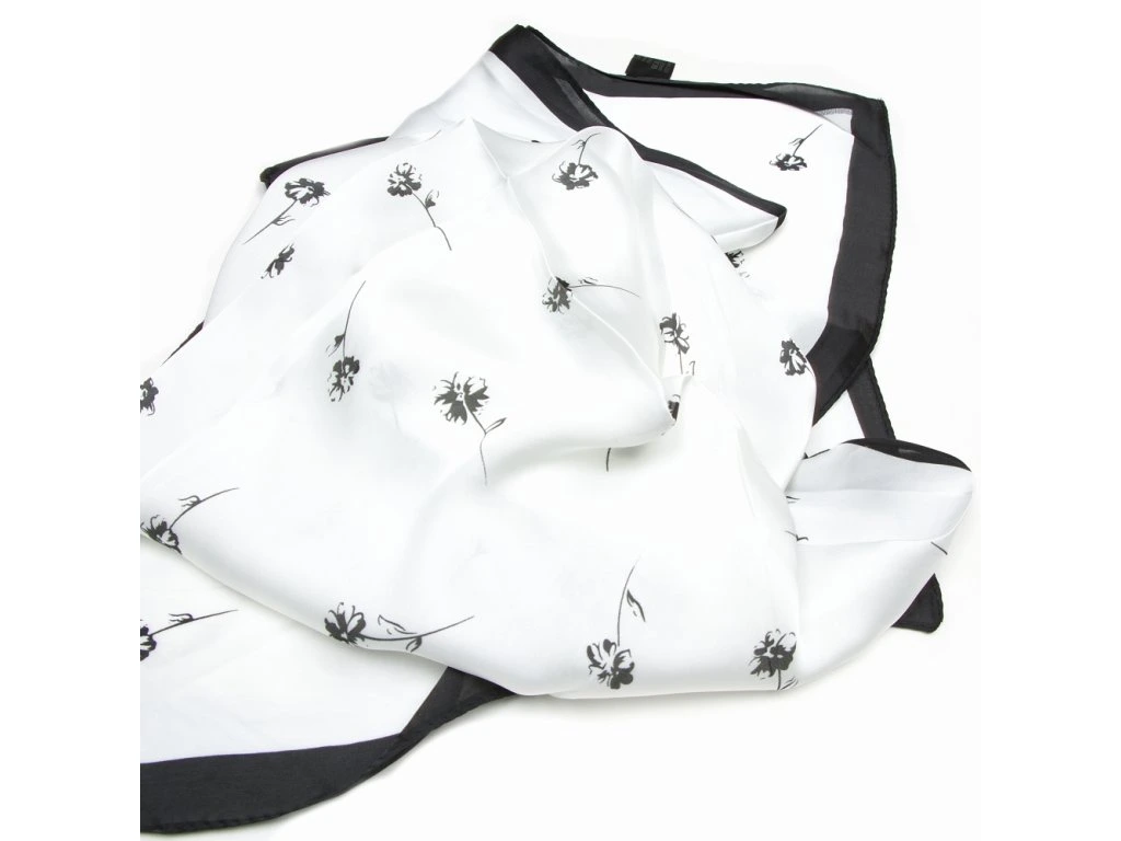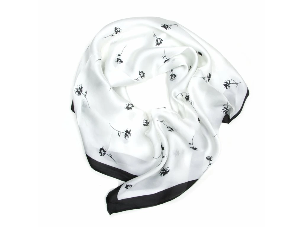 Lehký čtvercový šátek s motivem květin v černo-bílé barvě. Šátek je skvělý módní doplněk na kabelku, do vlasů nebo klasicky okolo krku.