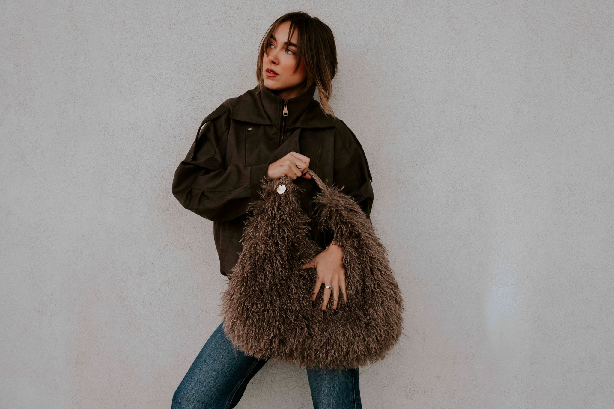 Stylová kabelka s kožešinou v taupe barvě působí luxusně a zároveň moderně. Je bez venkovních kapes, takže vynikne její čistý a sofistikovaný design. Interiér nabízí jednu prostornou hlavní kapsu a menší boční kapsu na drobnosti, která se uzavírá zipem. Součástí kabelky je přídavný popruh s karabinami, díky němuž ji lze pohodlně nosit i přes tělo. Kabelka se uzavírá zipem a její vzhled podtrhuje zlatý přívěsek Alex Max.