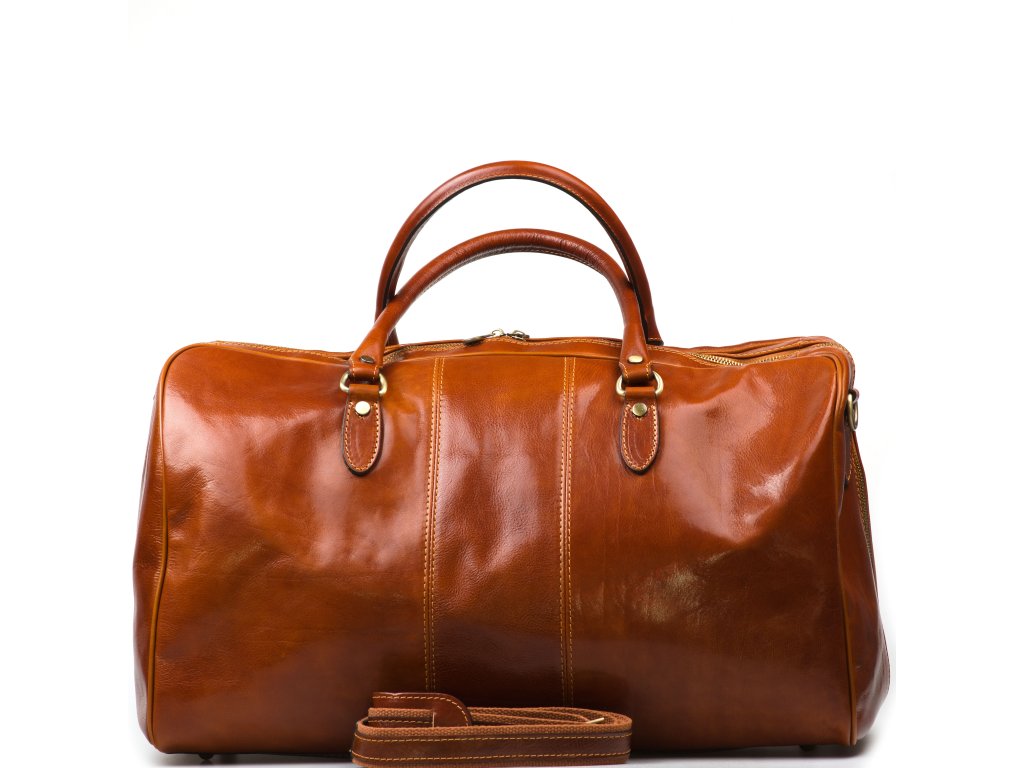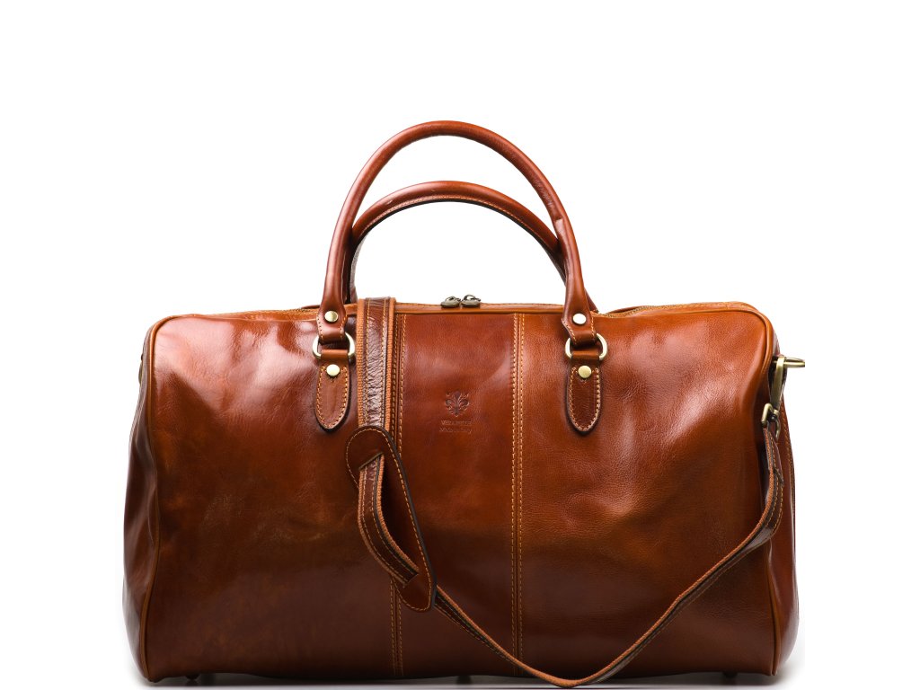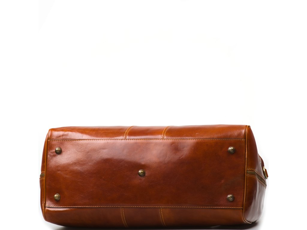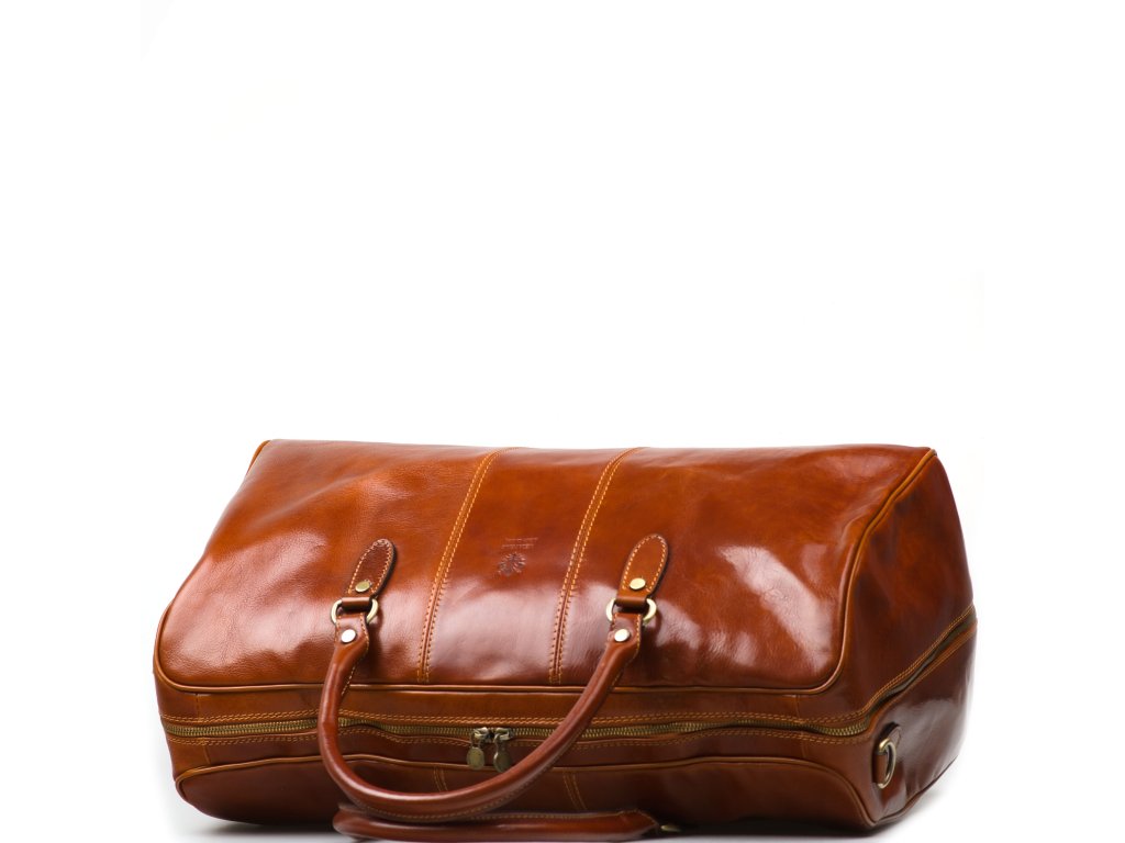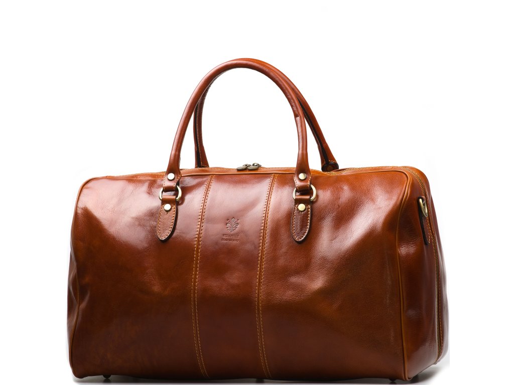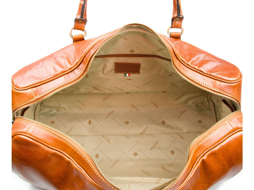 Luxusní kožená cestovní taška pro ženy i muže v koňakově hnědé barvě. Taška je vyrobená z hladké kvalitní toskánské kůže . Taška je po povrchu prošitá béžovým stehem. Součástí tašky je přídavný popruh s masívními karabinami v kombinaci kůže a tkanina. Taška se uzavírá zipem. Cestovní taška Josslyn je kvalitní investicí na celý život.