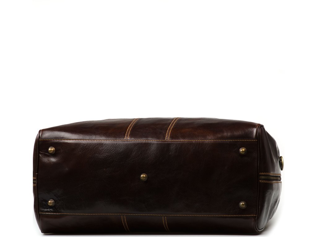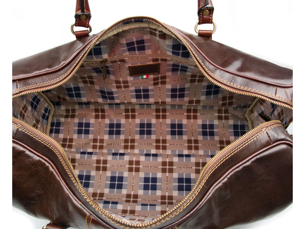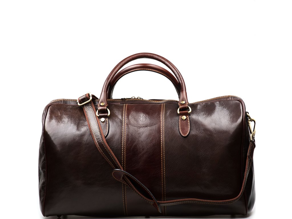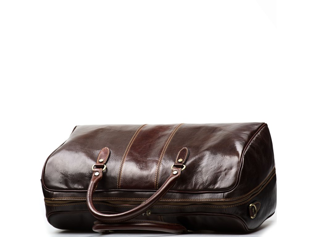 Luxusní kožená cestovní taška pro ženy i muže v tmavě hnědé barvě. Taška je vyrobená z hladké kvalitní toskánské kůže . Taška je po povrchu prošitá béžovým stehem. Součástí tašky je přídavný popruh s masívními karabinami v kombinaci kůže a tkanina. Taška se uzavírá zipem. Cestovní taška Josslyn je kvalitní investicí na celý život.