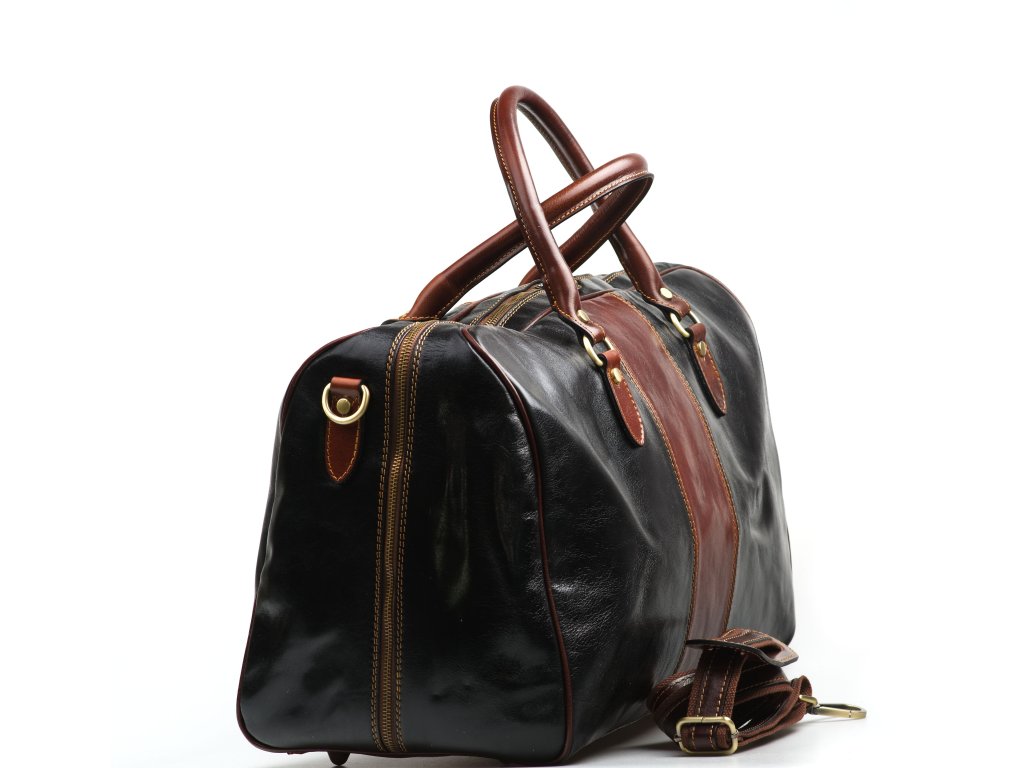Luxusní kožená cestovní taška pro ženy i muže v černé barvě. Taška je vyrobená z hladké kvalitní toskánské kůže . Součástí tašky je přídavný popruh s masívními karabinami v kombinaci kůže a tkanina. Taška se uzavírá zipem. Cestovní tašku zdobí kontrast s hnědou kůží.