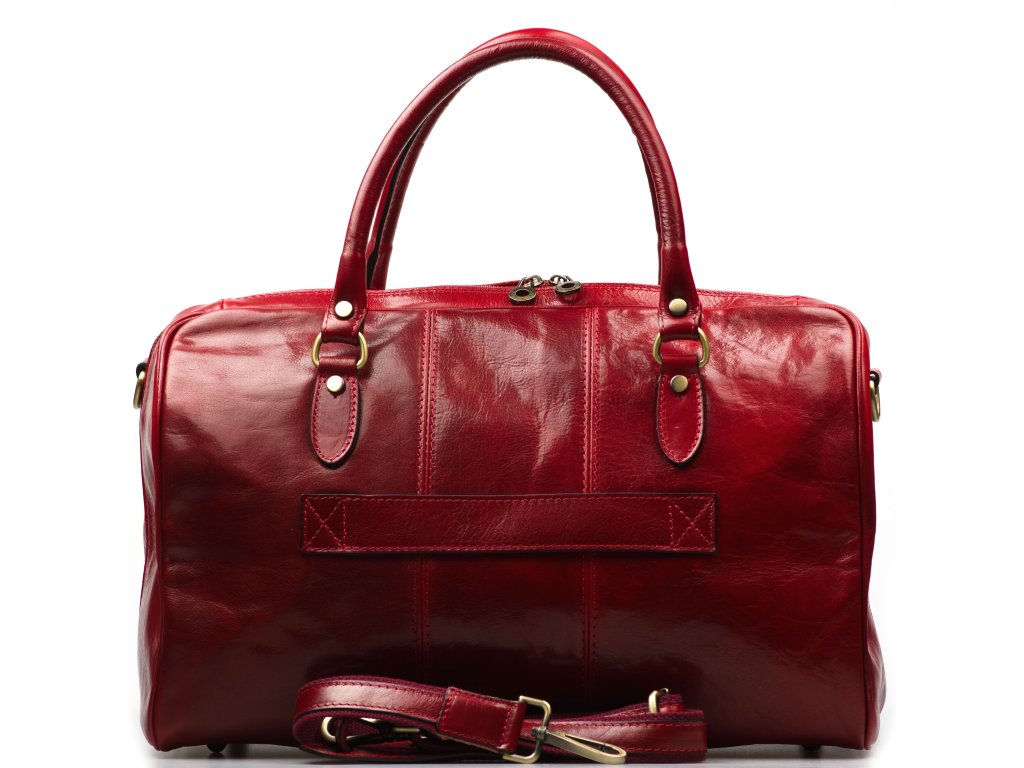 Luxusní kožená cestovní taška pro ženy i muže v červené barvě. Taška je vyrobená z hladké kvalitní toskánské kůže. Součástí tašky je přídavný popruh s masívními karabinami v kombinaci kůže a tkanina. Taška se zavírá zipem.