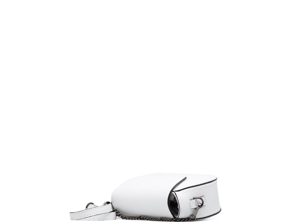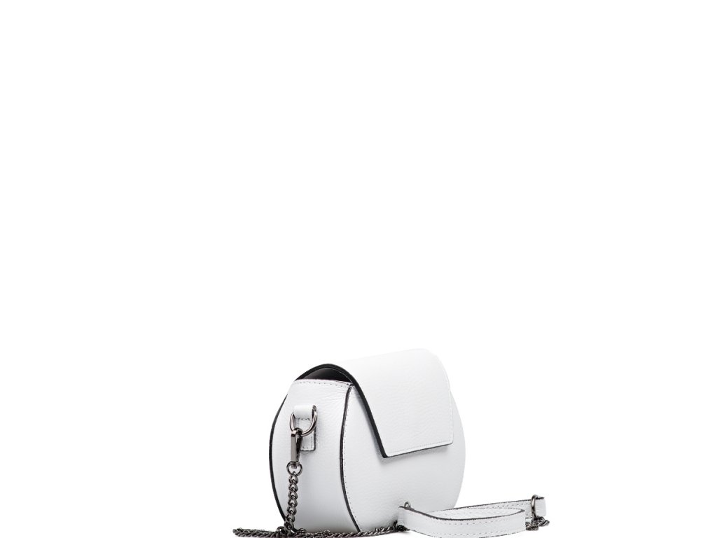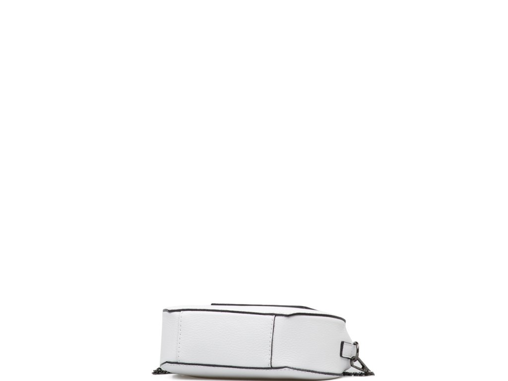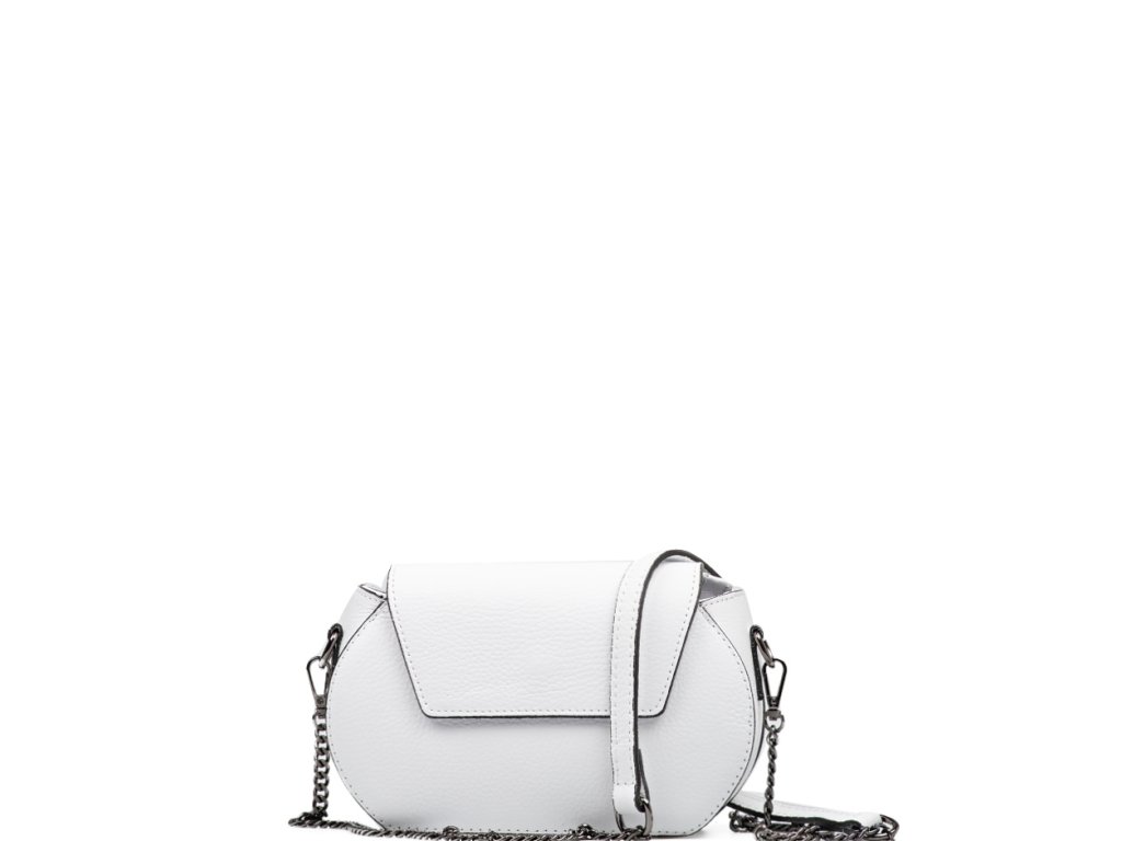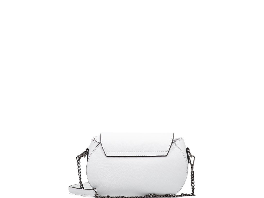 Malá kožená crossbody kabelka s řetízkovým popruhem v bílé barvě. Součástí kabelky je popruh s karabinami v kombinaci řetízek a kůže. Interiér kabelky disponuje jednou úložnou kapsou. Kabelka se uzavírá zipem a klopou na cvoček.