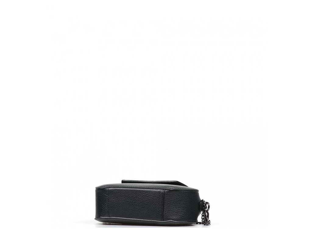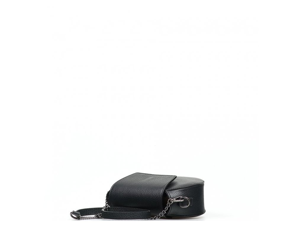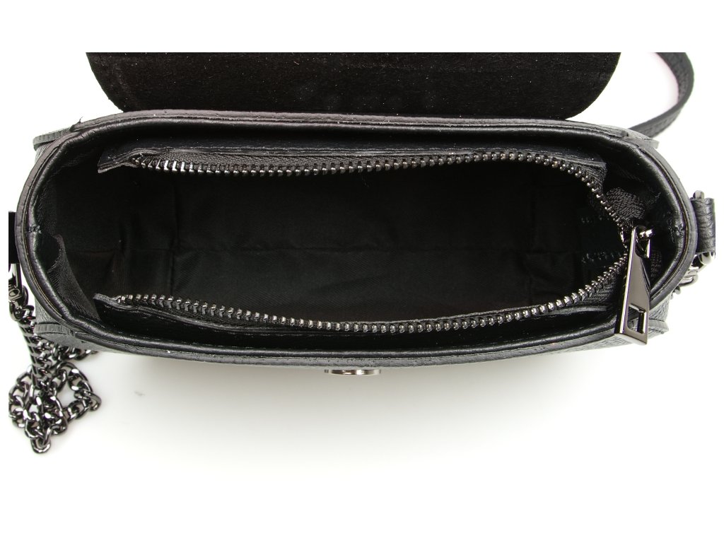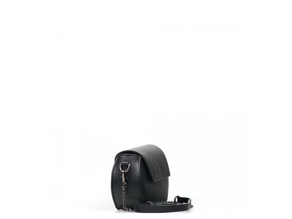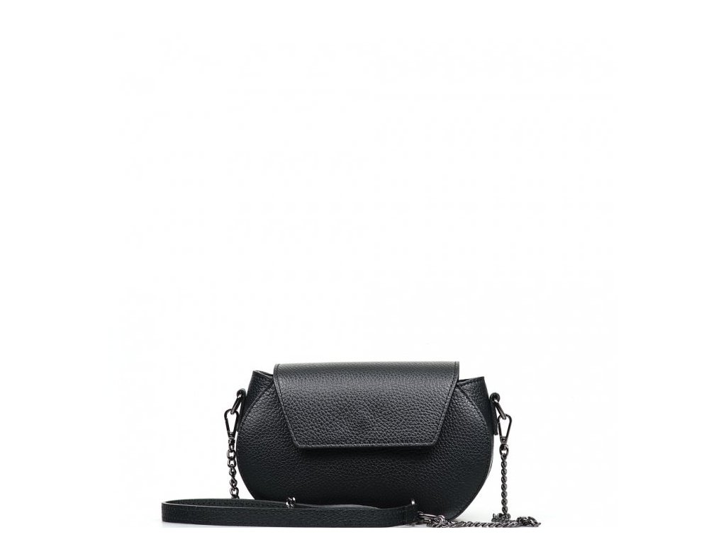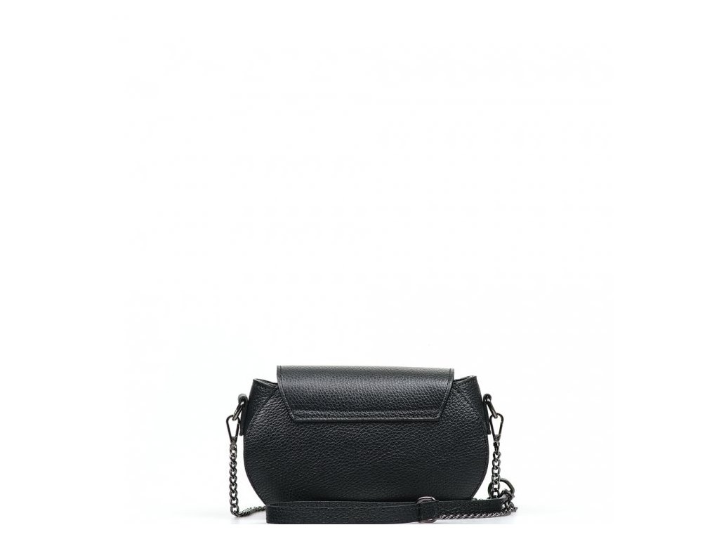 Malá kožená crossbody kabelka s řetízkovým popruhem v černé barvě. Součástí kabelky je popruh s karabinami v kombinaci řetízek a kůže. Interiér kabelky disponuje jednou úložnou kapsou. Kabelka se uzavírá zipem a klopou na cvoček.