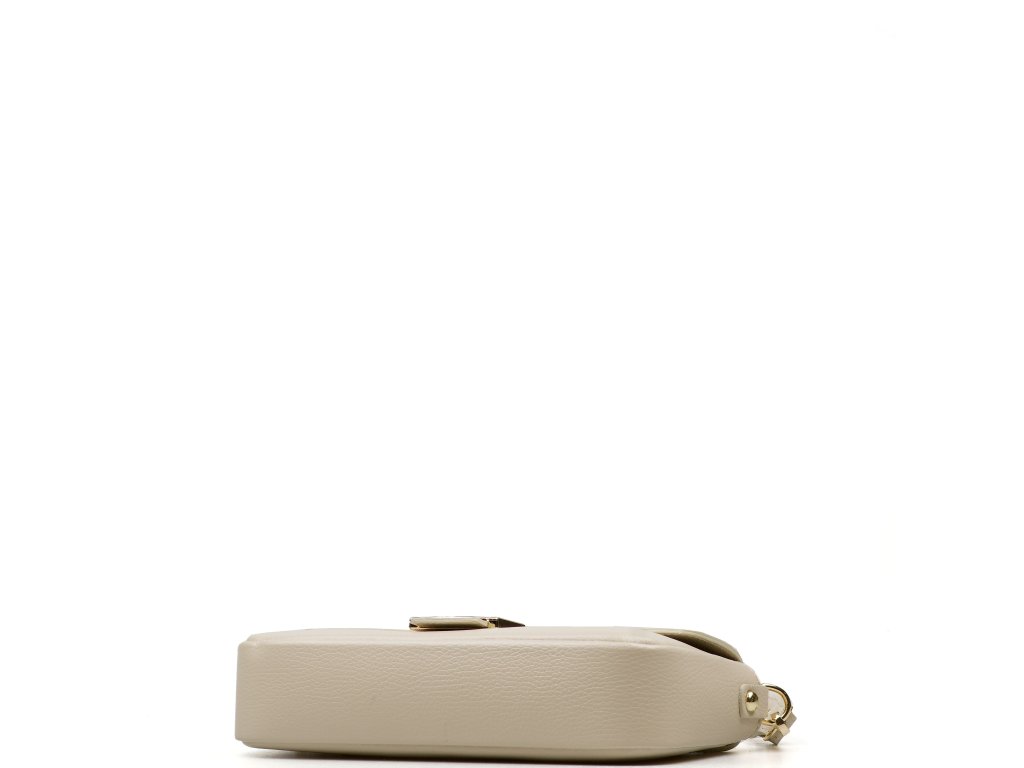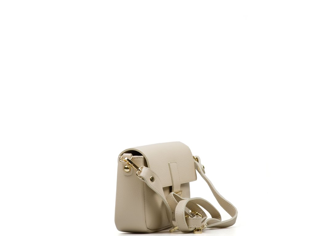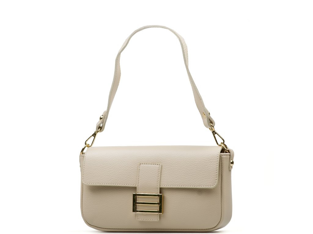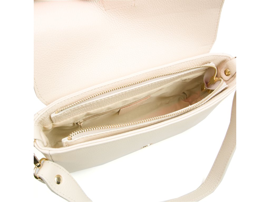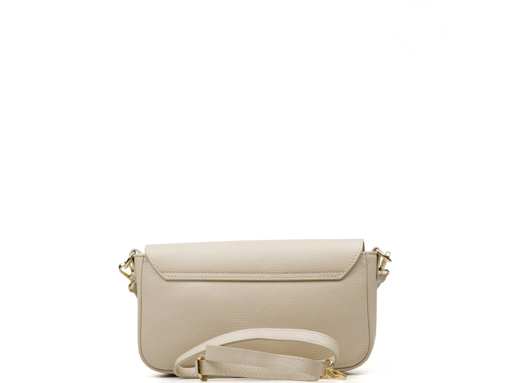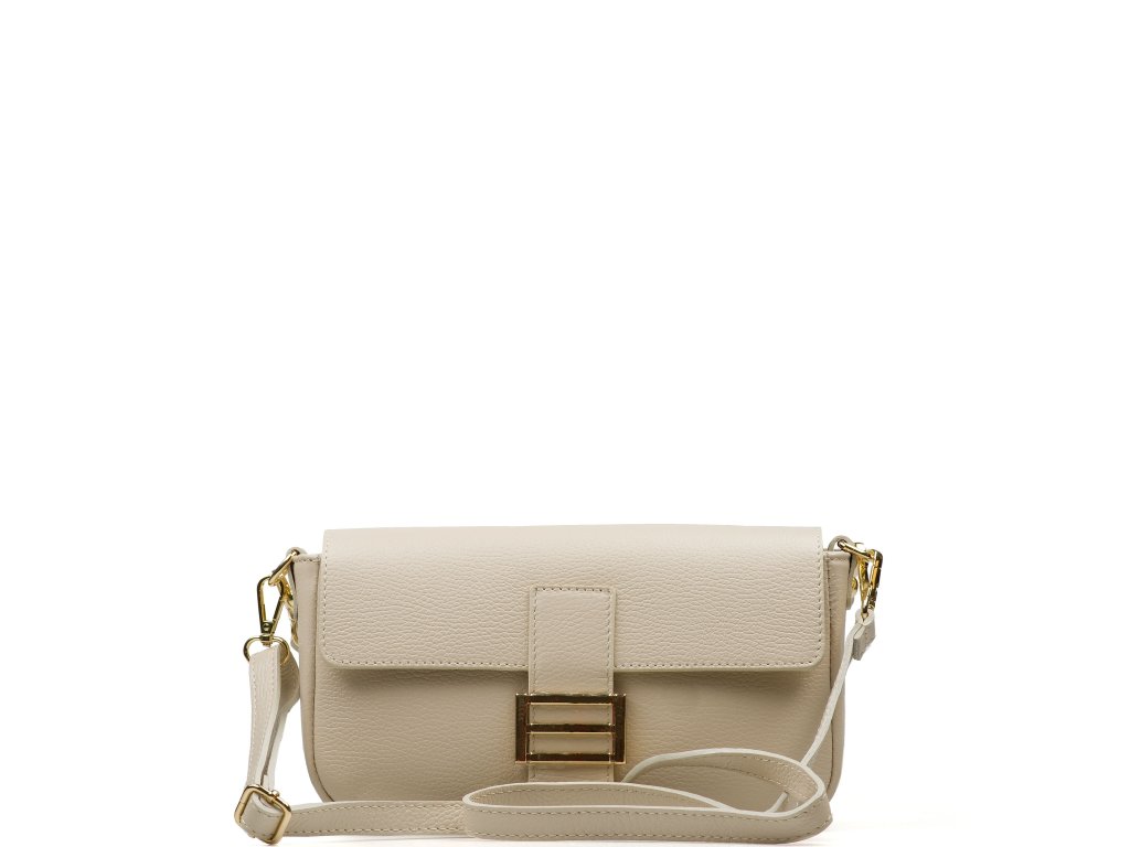 Kožená crossbody kabelka v béžové barvě. Prakticky řešený interiér nabízí jednu hlavní kapsu a jednu menší kapsu na zip pro bezpečné uložení drobností. Kabelku lze nosit jako psaníčko do ruky, pohodlně přes rameno nebo jako crossbody přes tělo díky přídavným popruhům. Uzavírání na zip je doplněno ozdobnou sponou, která dodává kabelce elegantní vzhled.
