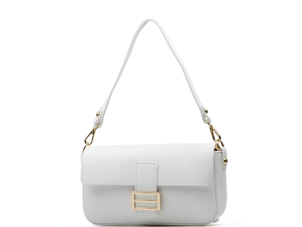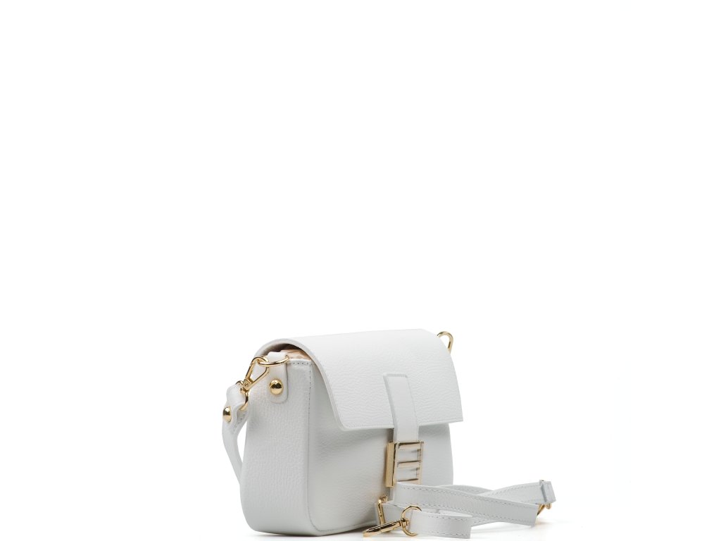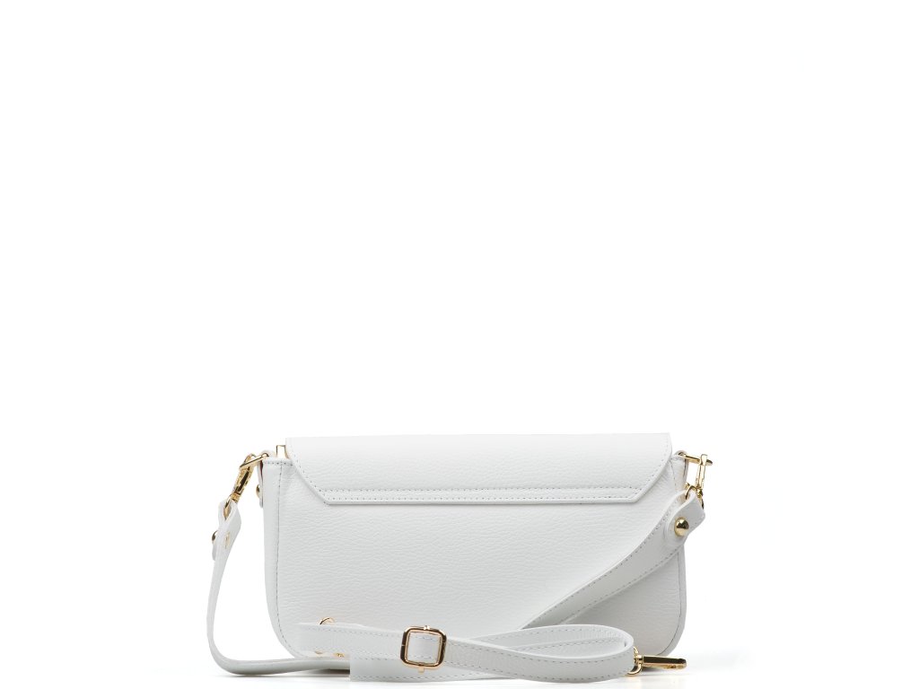 Kožená crossbody kabelka v bílé barvě. Prakticky řešený interiér nabízí jednu hlavní kapsu a jednu menší kapsu na zip pro bezpečné uložení drobností. Kabelku lze nosit jako psaníčko do ruky, pohodlně přes rameno nebo jako crossbody přes tělo díky přídavným popruhům. Uzavírání na zip je doplněno ozdobnou sponou, která dodává kabelce elegantní vzhled.