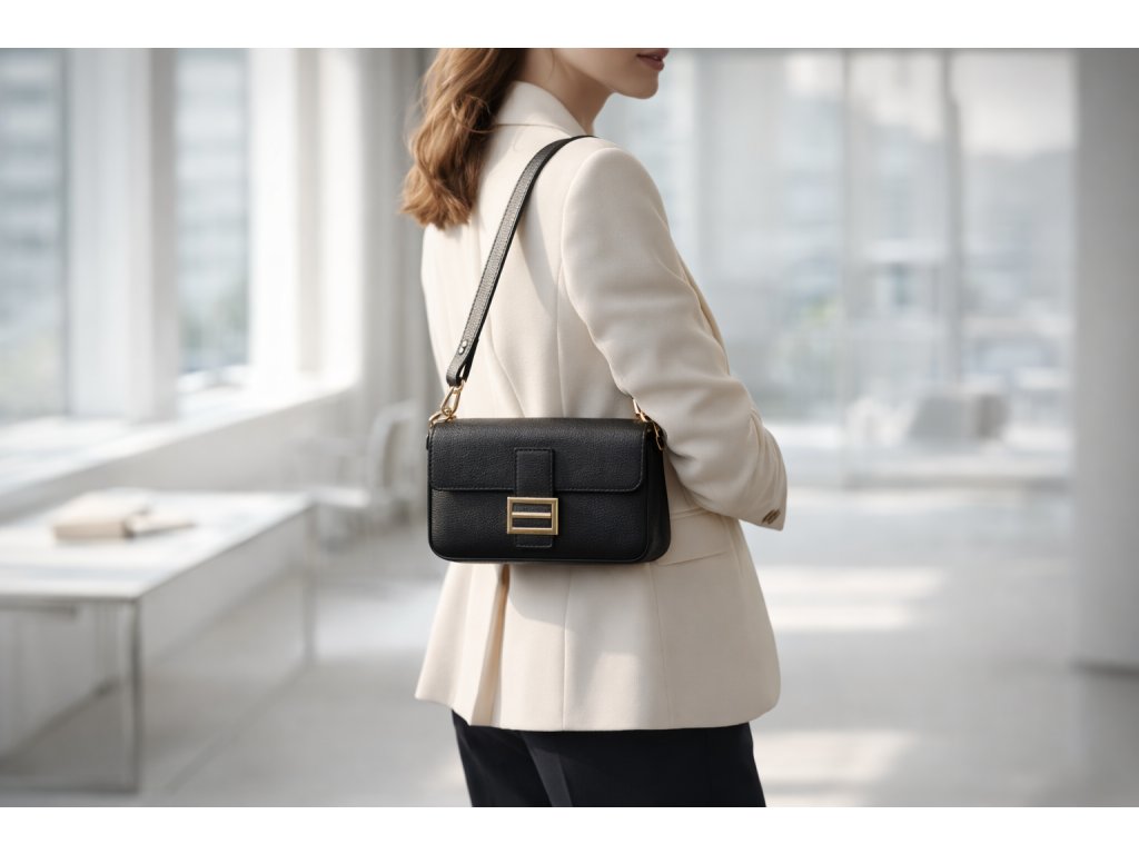 Kožená crossbody kabelka v černé barvě. Prakticky řešený interiér nabízí jednu hlavní kapsu a jednu menší kapsu na zip pro bezpečné uložení drobností. Kabelku lze nosit jako psaníčko do ruky, pohodlně přes rameno nebo jako crossbody přes tělo díky přídavným popruhům. Uzavírání na zip je doplněno ozdobnou sponou, která dodává kabelce elegantní vzhled.