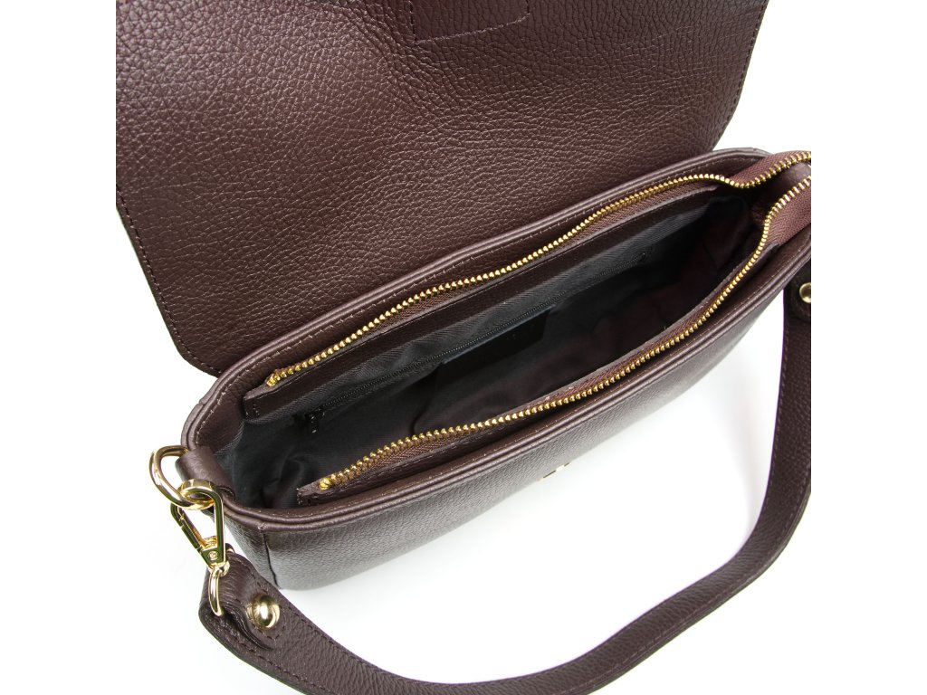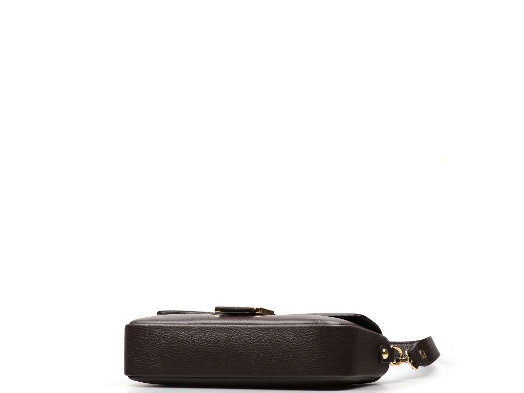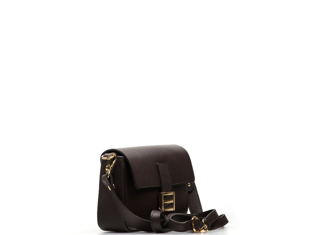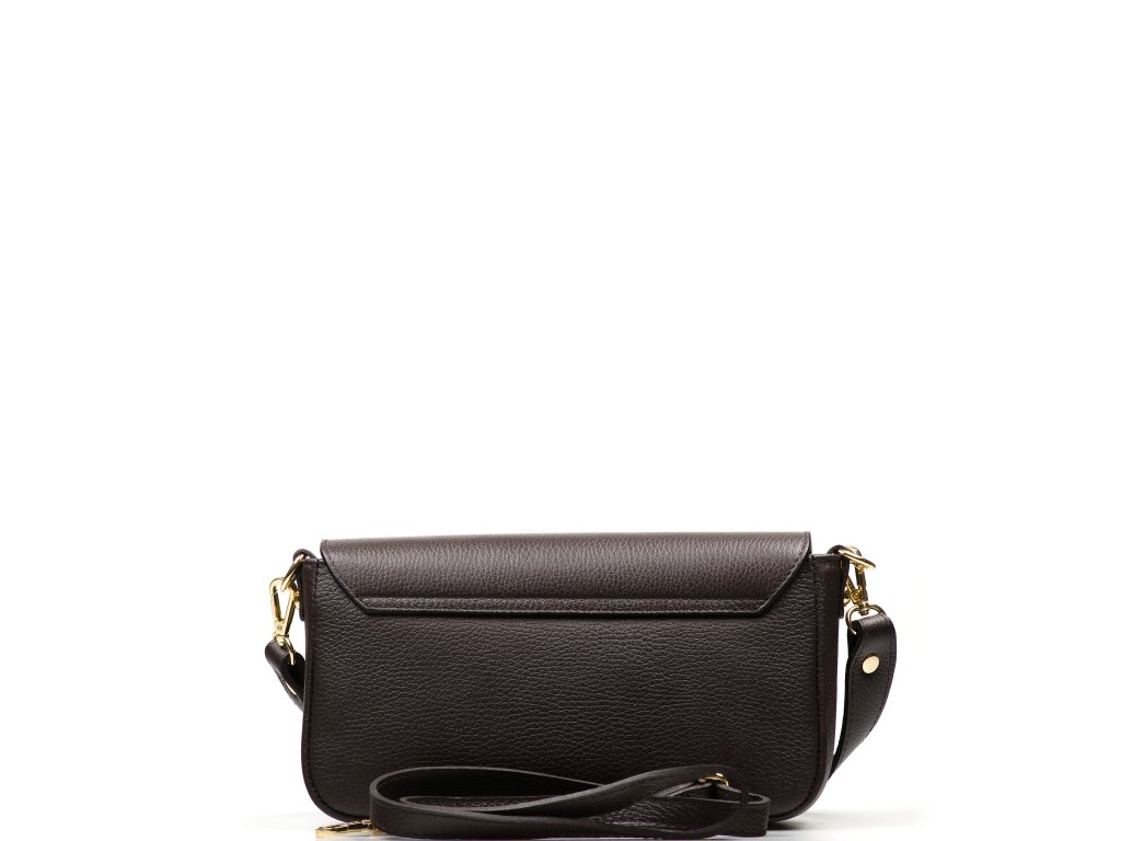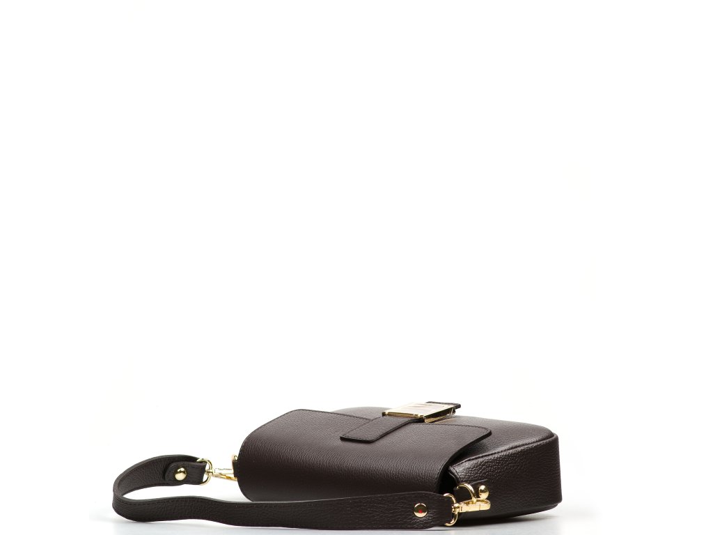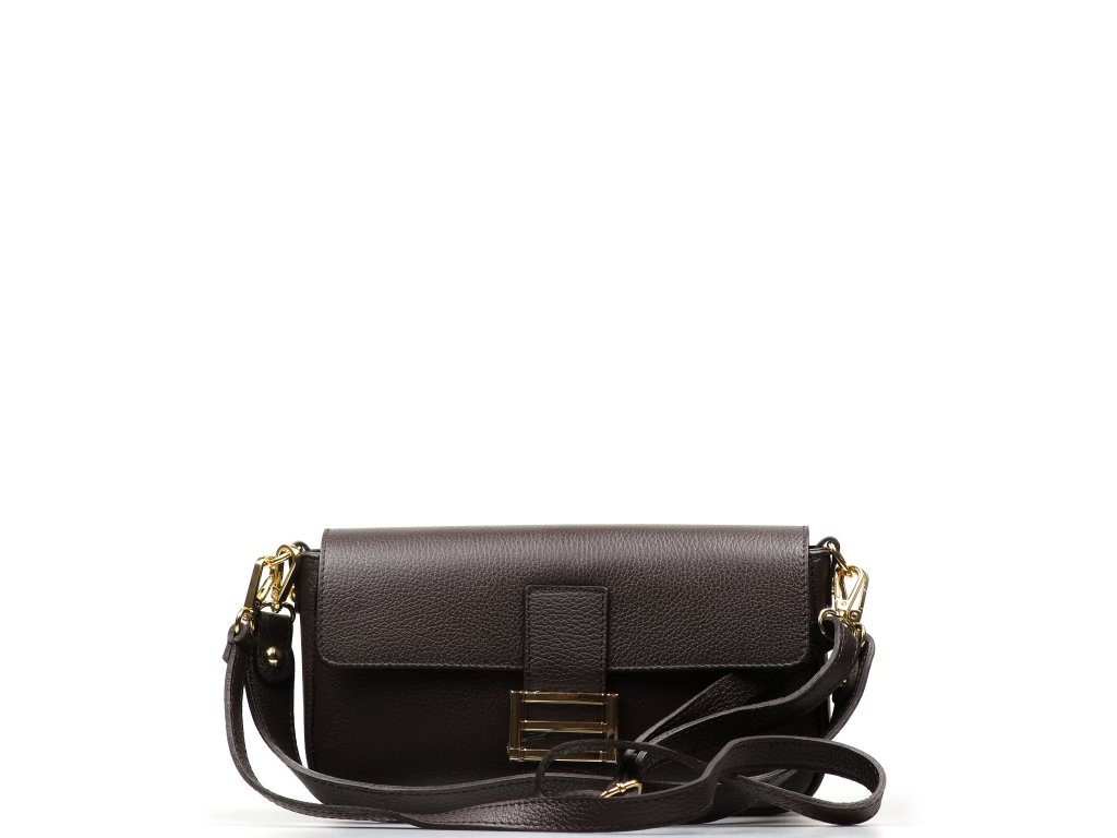 Kožená crossbody kabelka v tmavě hnědé barvě. Prakticky řešený interiér nabízí jednu hlavní kapsu a jednu menší kapsu na zip pro bezpečné uložení drobností. Kabelku lze nosit jako psaníčko do ruky, pohodlně přes rameno nebo jako crossbody přes tělo díky přídavným popruhům. Uzavírání na zip je doplněno ozdobnou sponou, která dodává kabelce elegantní vzhled.