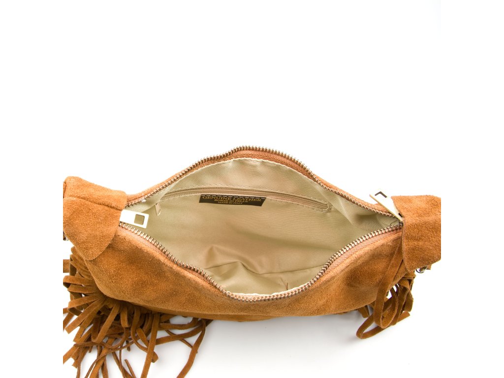 Semišová kožená kabelka v elegantní koňakově hnědé barvě je dokonalým spojením stylu a praktičnosti. Díky posuvnému přídavnému popruhu ji můžeš nosit v ruce, přes rameno nebo pohodlně jako crossbody. Nabízí jednu prostornou hlavní kapsu a menší boční kapsu na zip pro přehledné uspořádání všech nezbytností. Kabelka se uzavírá zipem, který zajistí bezpečné uložení tvých věcí. Stylový doplněk, který dodá tvému outfitu nádech elegance a originality.