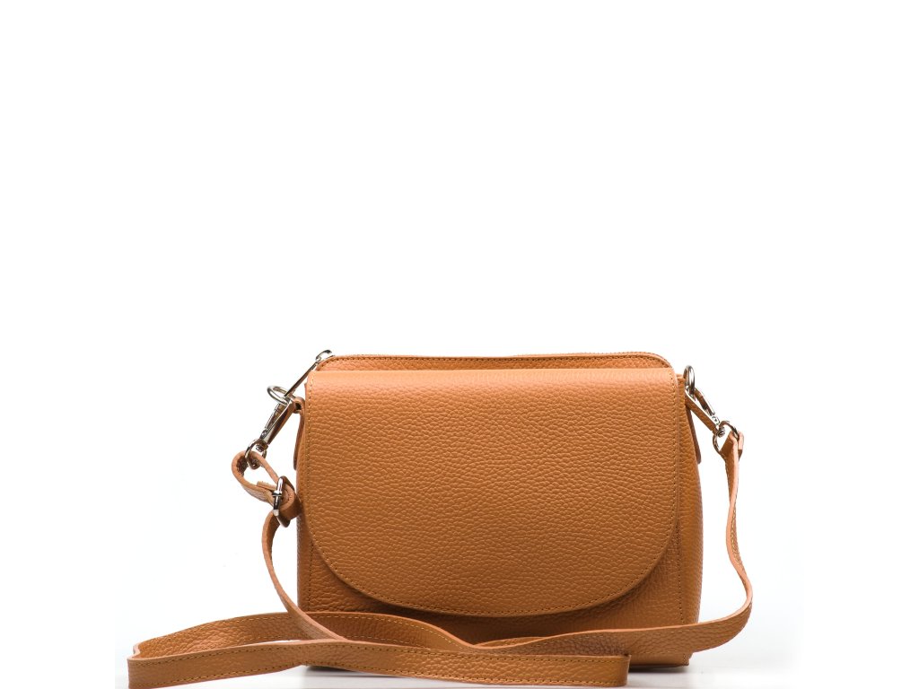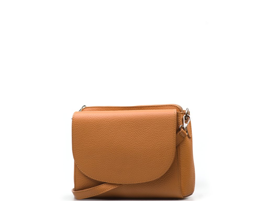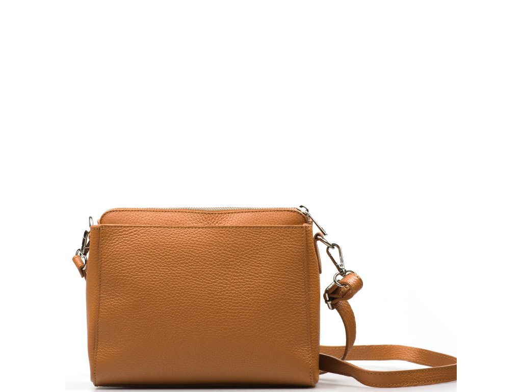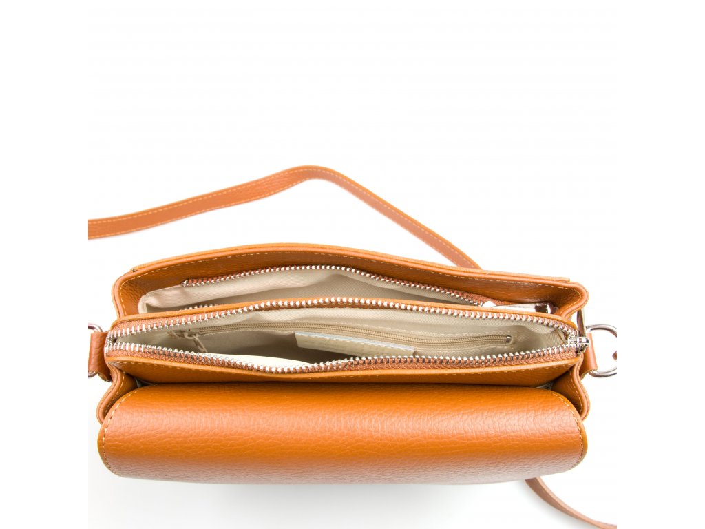 Dámská kožená crossbody kabelka s klopou v koňakově hnědé barvě. Kabelka má tři kapsy, každá se samostatným vstupem. Pod klopou jedna úložná kapsa, uprostřed hlavní kapsa s uzavřením na zip, třetí kapsa také na zip. Součástí je odnímatelný přídavný popruh s karabinami.