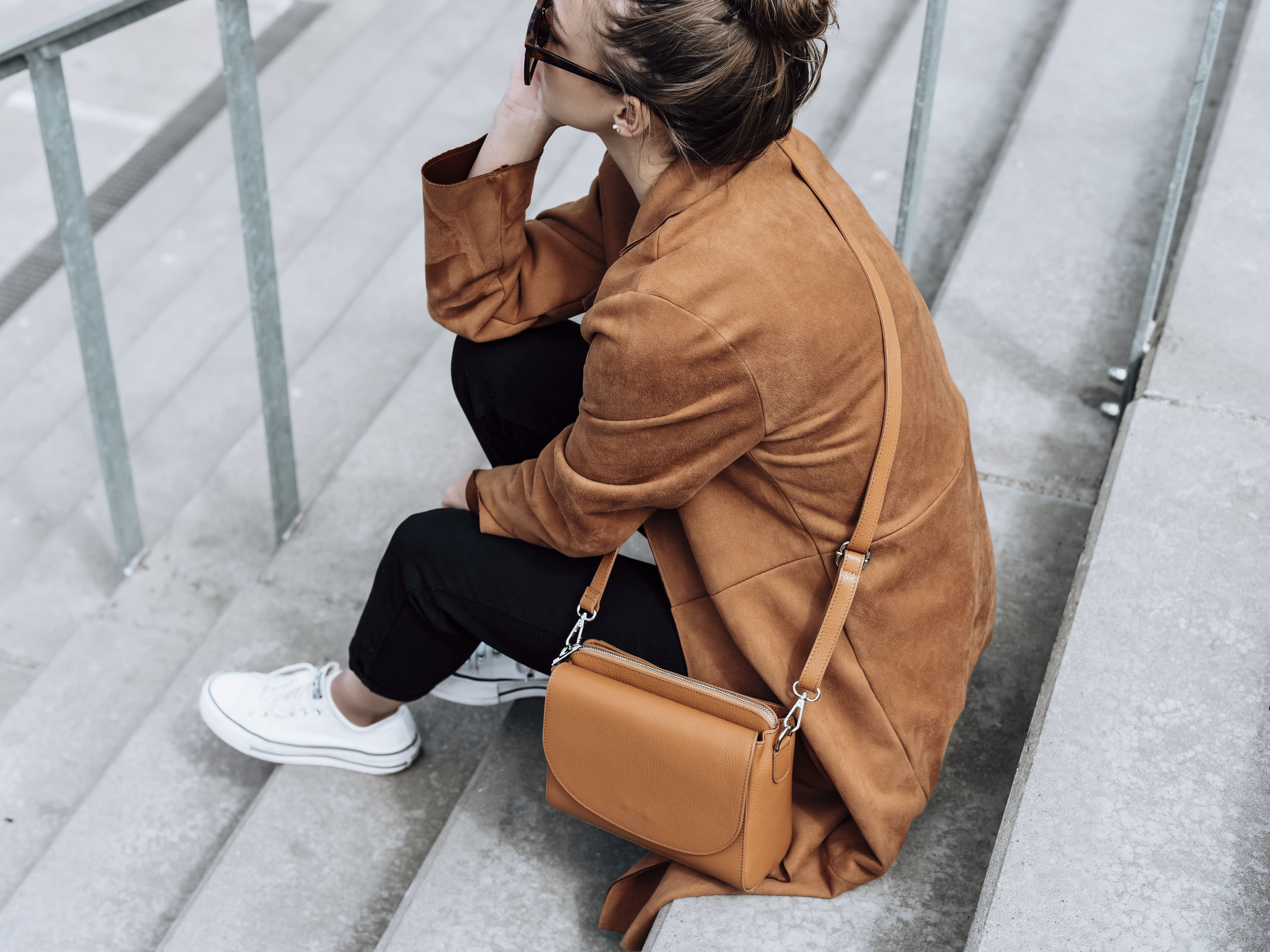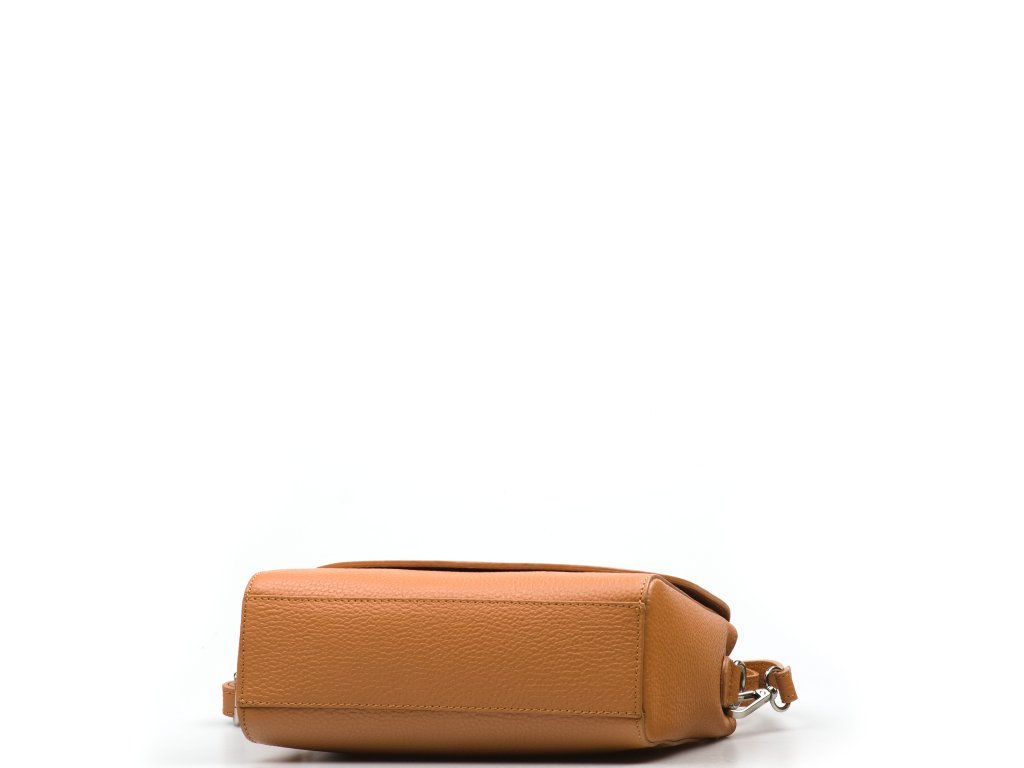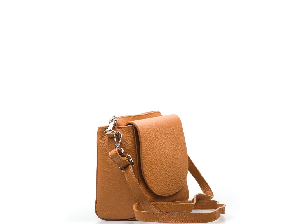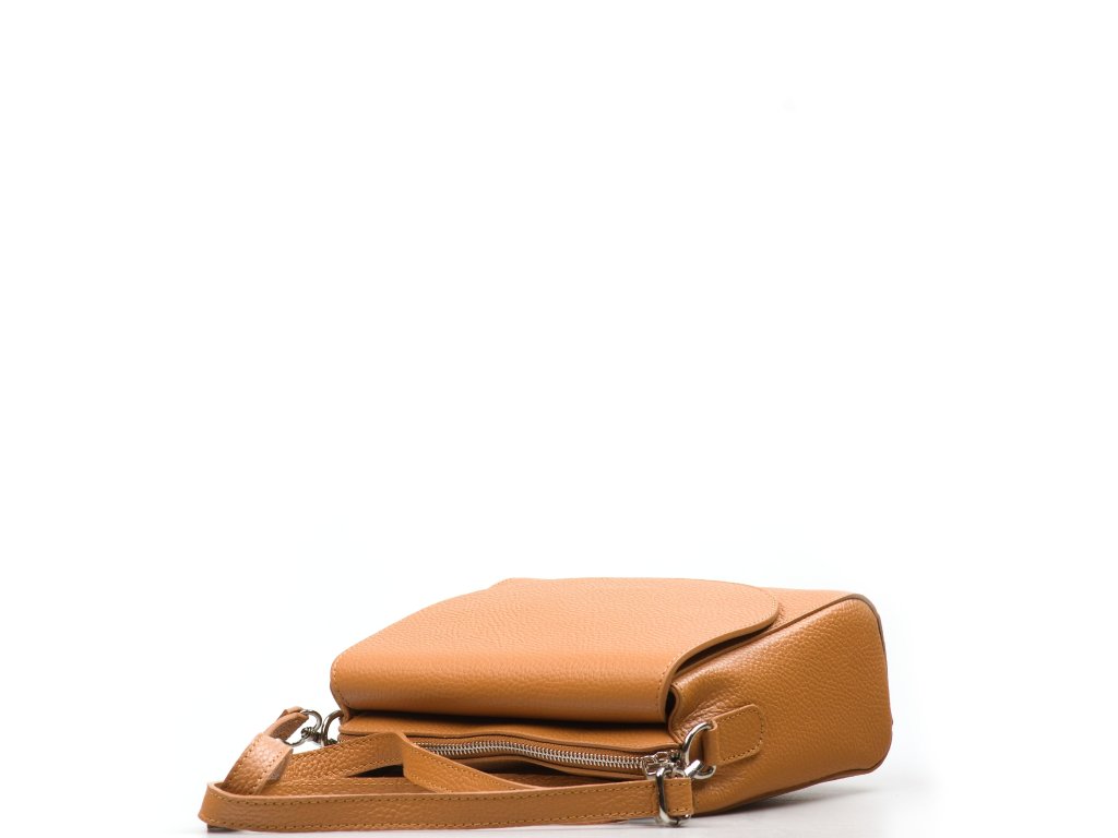 Dámská kožená crossbody kabelka s klopou v koňakově hnědé barvě. Kabelka má tři kapsy, každá se samostatným vstupem. Pod klopou jedna úložná kapsa, uprostřed hlavní kapsa s uzavřením na zip, třetí kapsa také na zip. Součástí je odnímatelný přídavný popruh s karabinami.