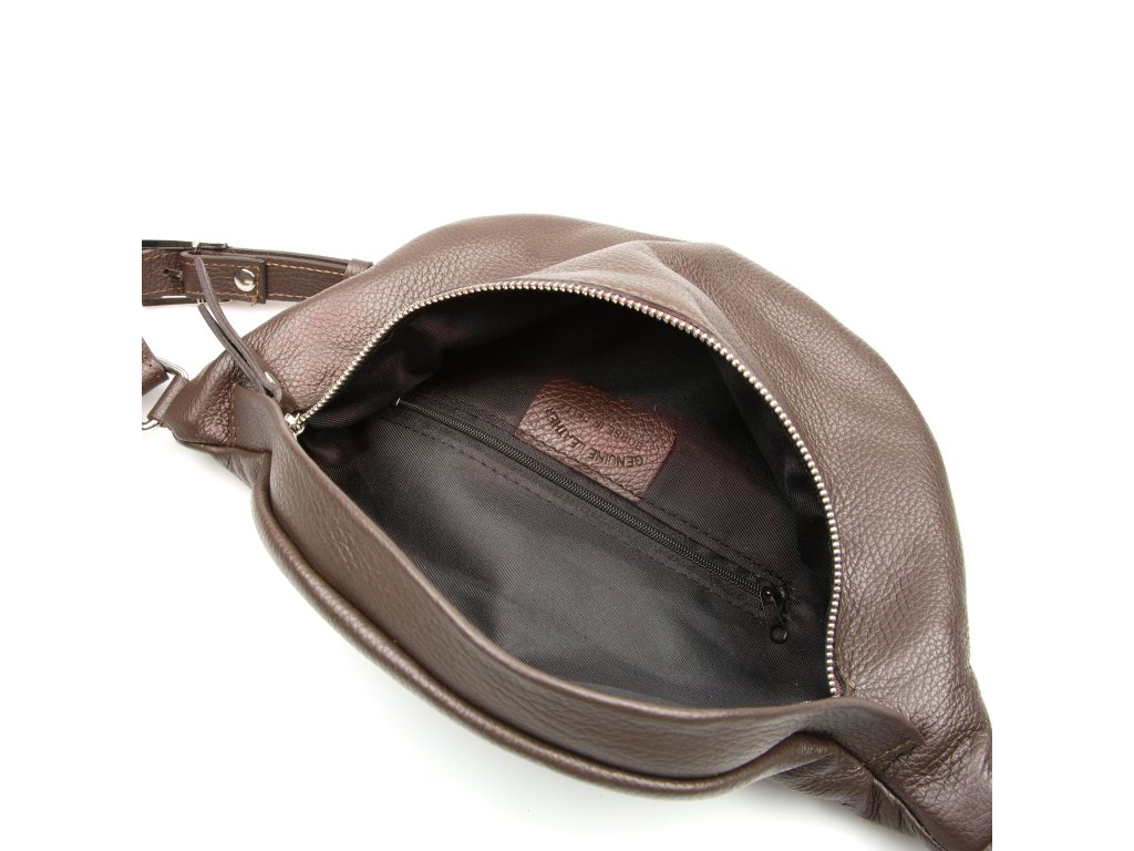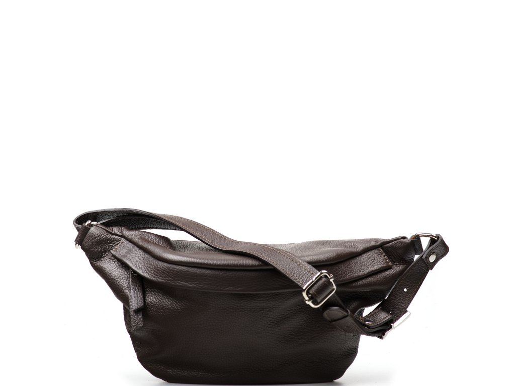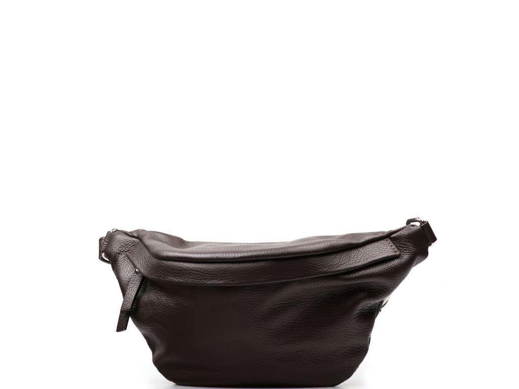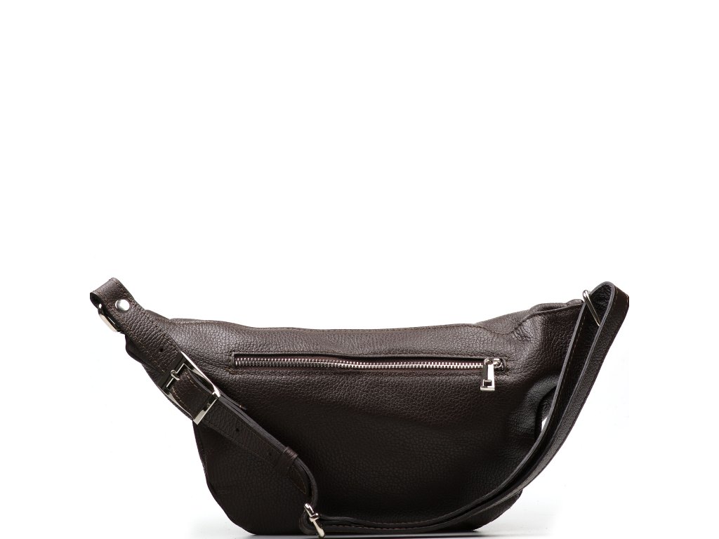 Velká kožená crossbody ledvinka v hnědá barvě. Ledvinka má fixní popruh se zapínáním na přezku. Interiér kabelky má jednu hlavní úložnou kapsu a malou boční na zip. Zadní strana ledvinky je vybavená malou funkční kapsou na zip. Ledvinka se uzavírá zipem.