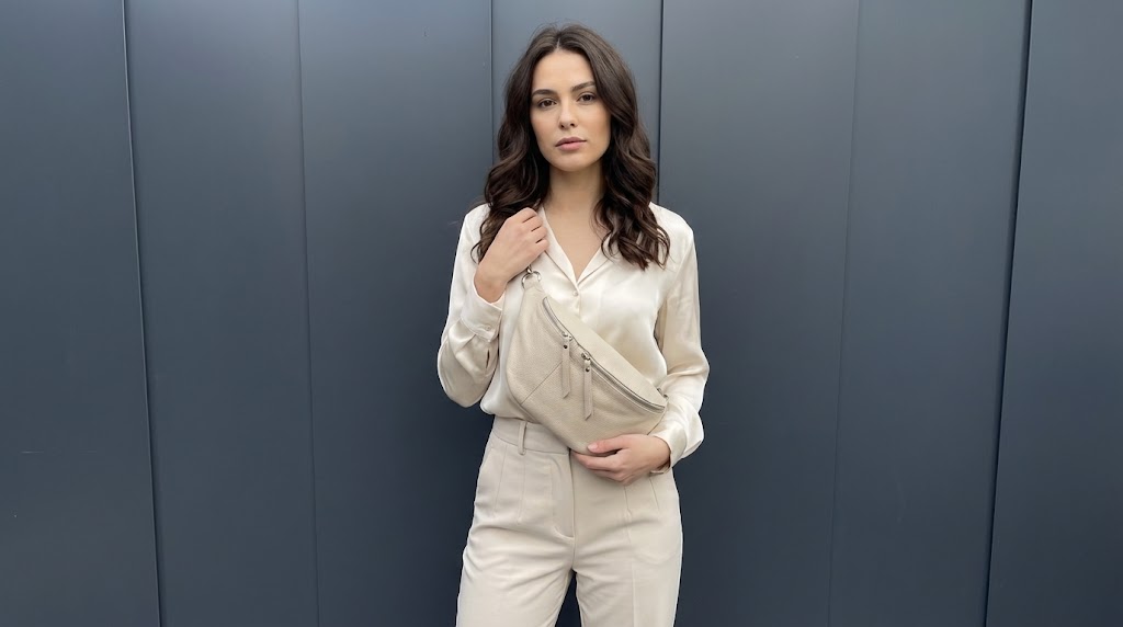 Velká kožená crossbody ledvinka v bílé barvě. Kabelka disponuje jednou hlavní kapsou a dvěma bočními na zip. Součástí kabelky je přídavný popruh. Kabelka je uzavíratelná zipem.
