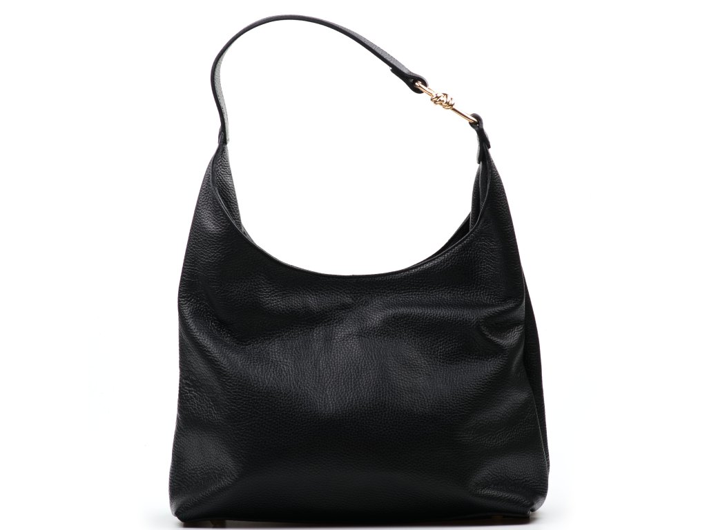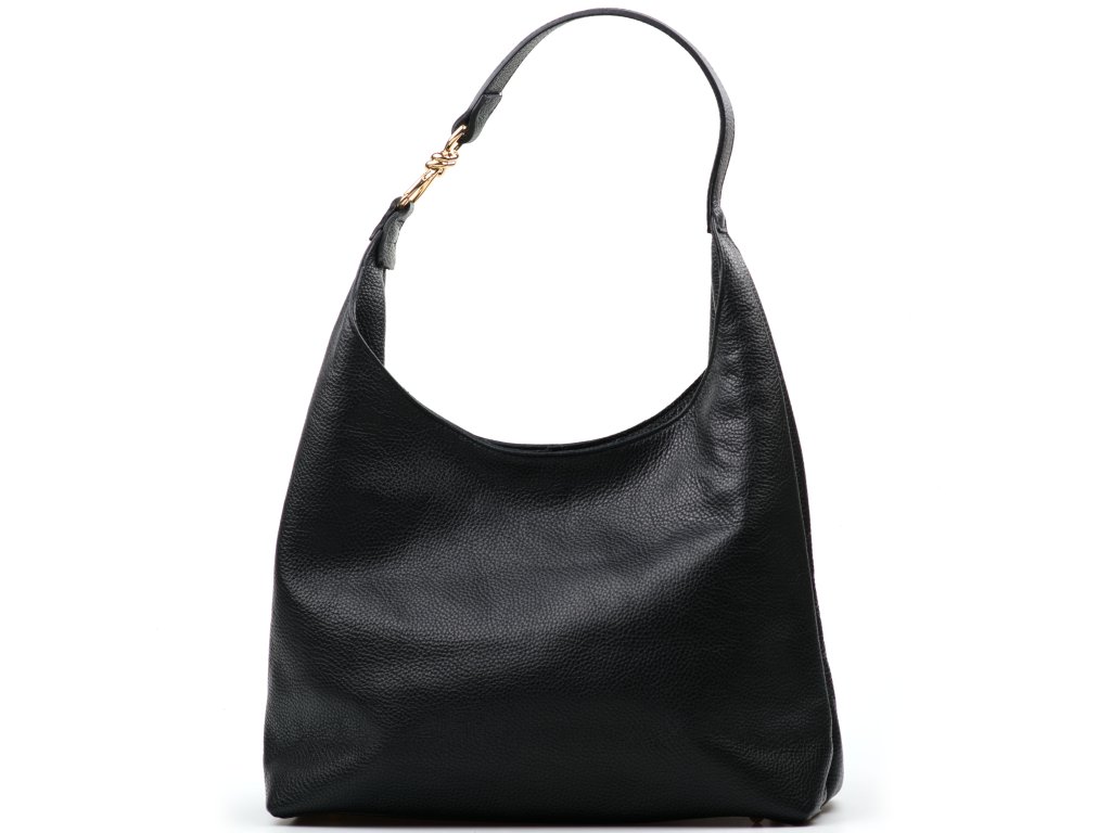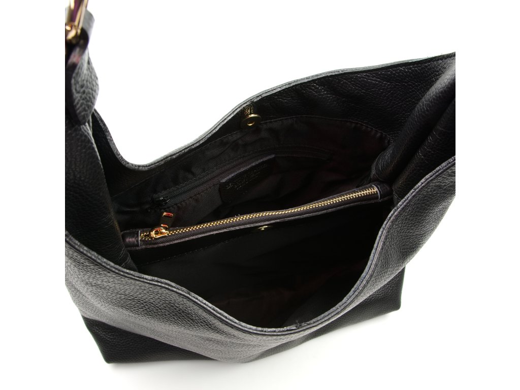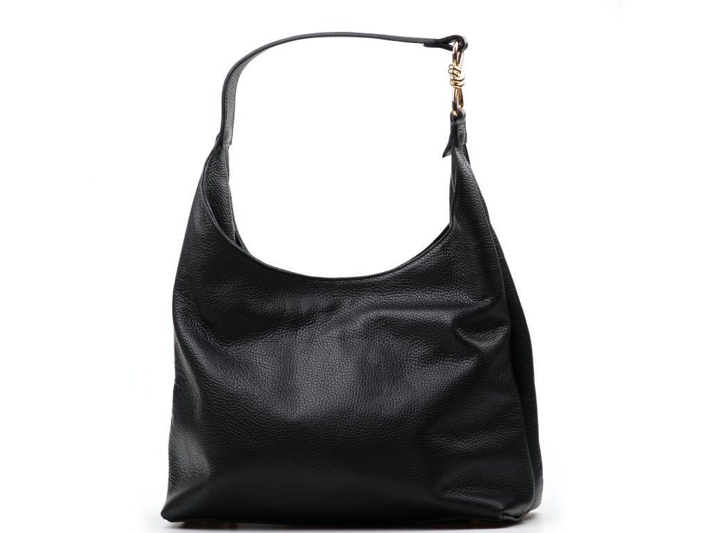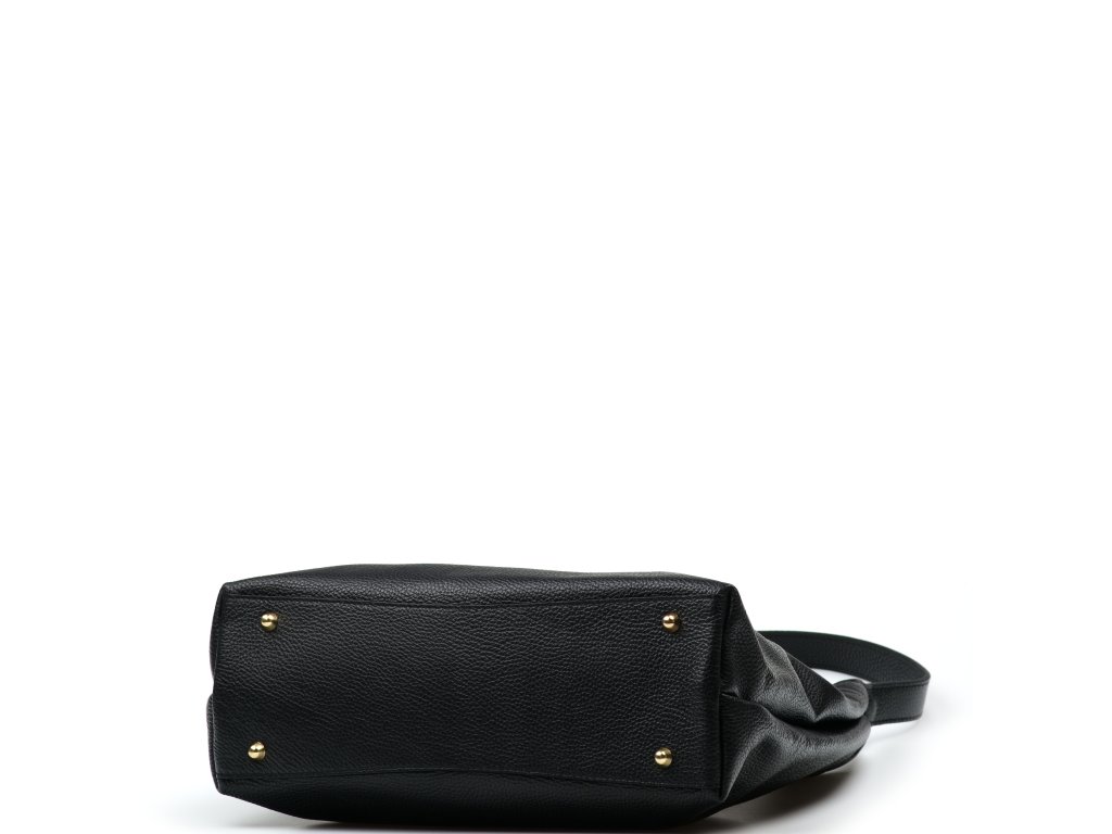 Minimalistická kožená kabelka přes rameno v černé barvě působí elegantně a nadčasově. Její interiér nabízí tři praktické úložné kapsy, z nichž prostřední se uzavírá zipem pro bezpečné uložení cenností. Jemným detailem, který kabelce dodává ženský šarm, je zlatá mašle umístěná na uchu. Kabelka se uzavírá cvokem.