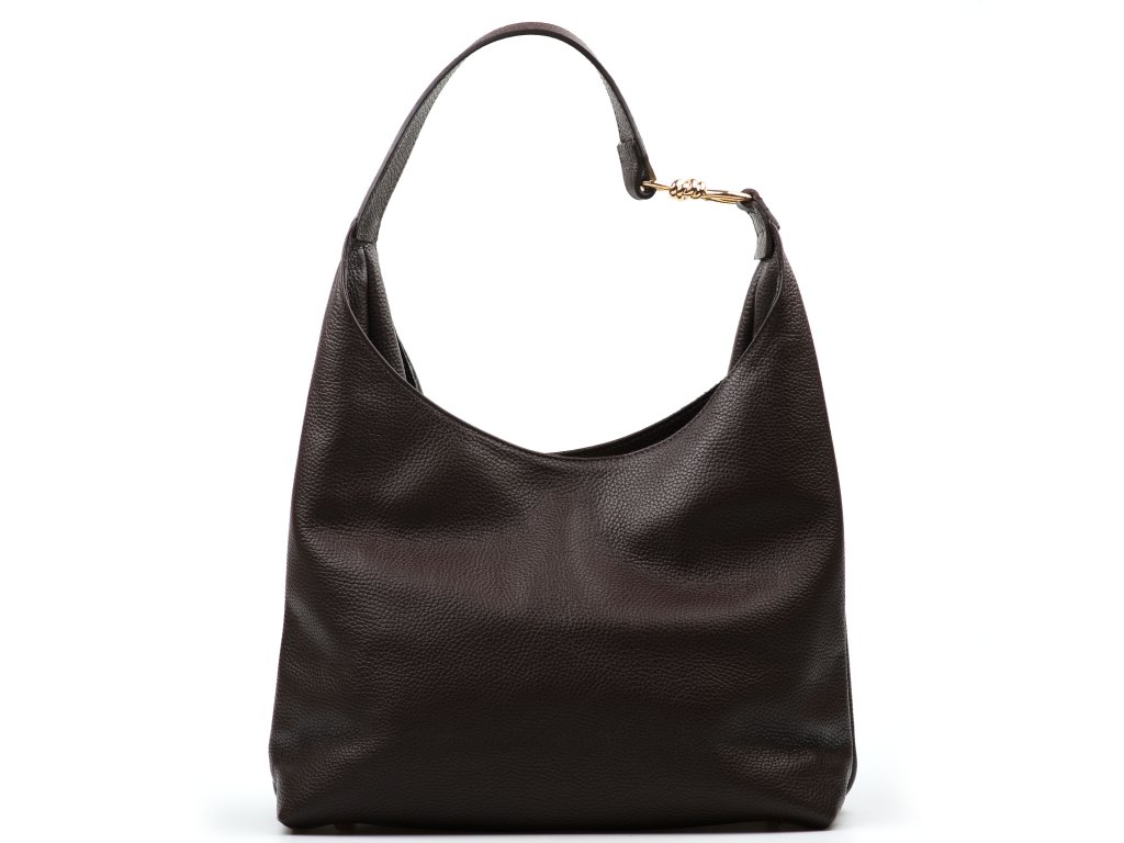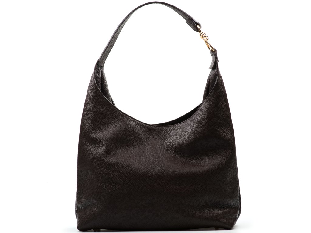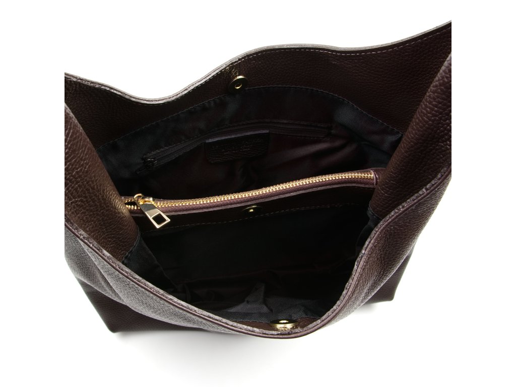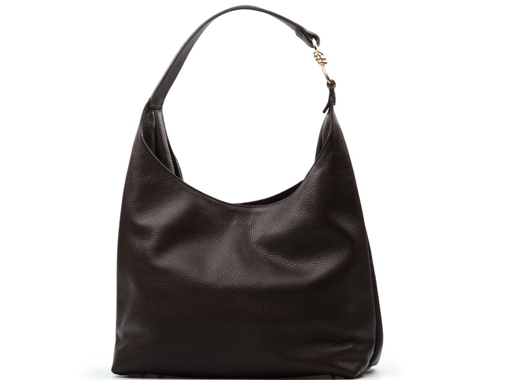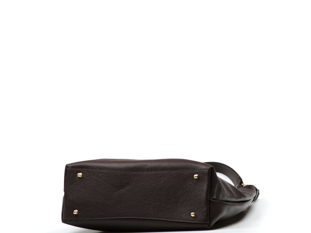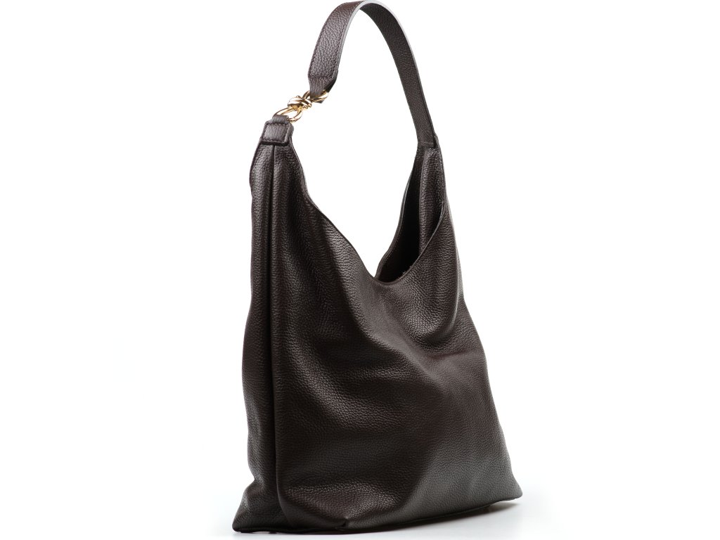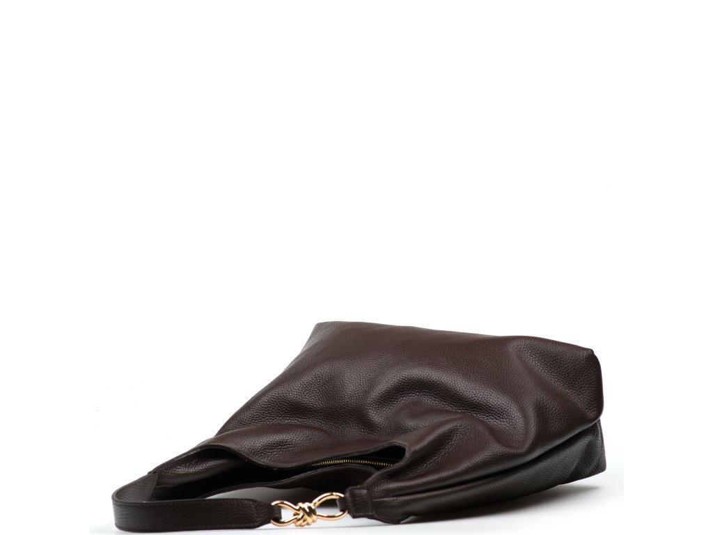 Minimalistická kožená kabelka přes rameno v tmavě hnědé barvě působí elegantně a nadčasově. Její interiér nabízí tři praktické úložné kapsy, z nichž prostřední se uzavírá zipem pro bezpečné uložení cenností. Jemným detailem, který kabelce dodává ženský šarm, je zlatá mašle umístěná na uchu. Kabelka se uzavírá cvokem.