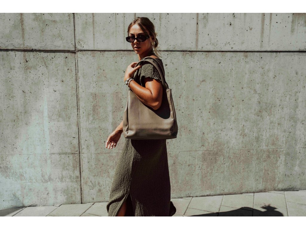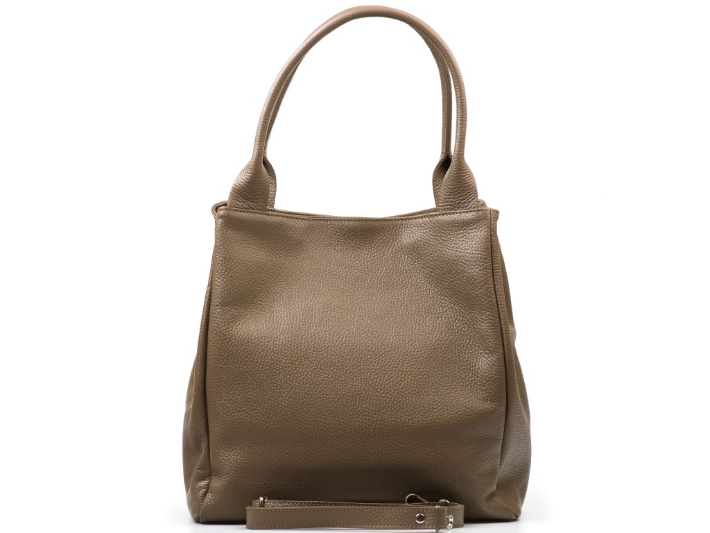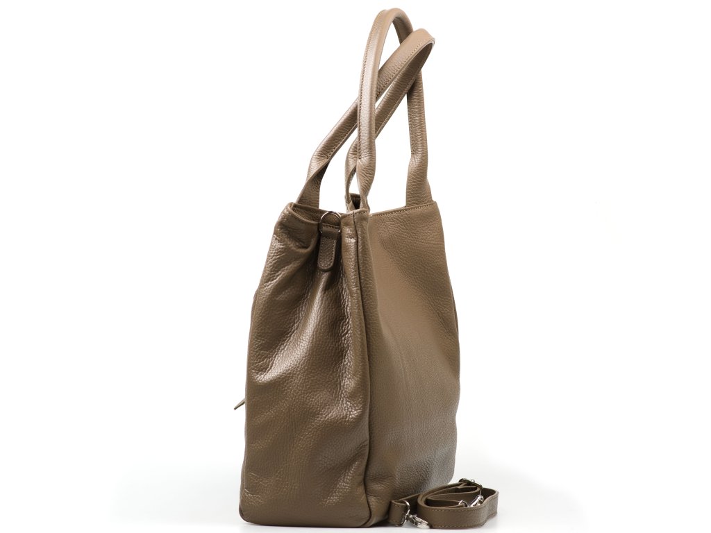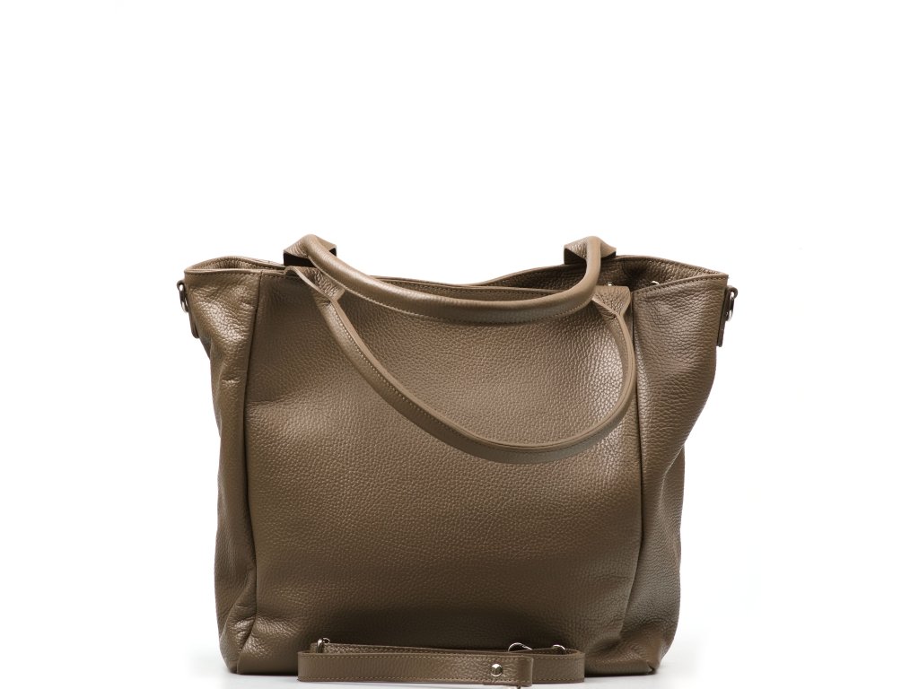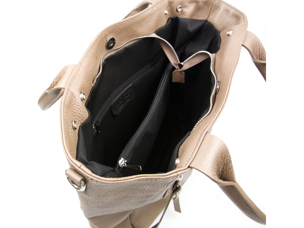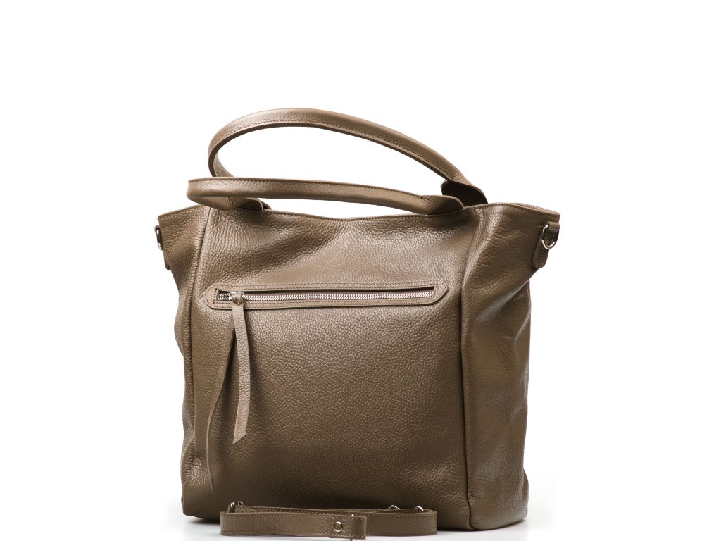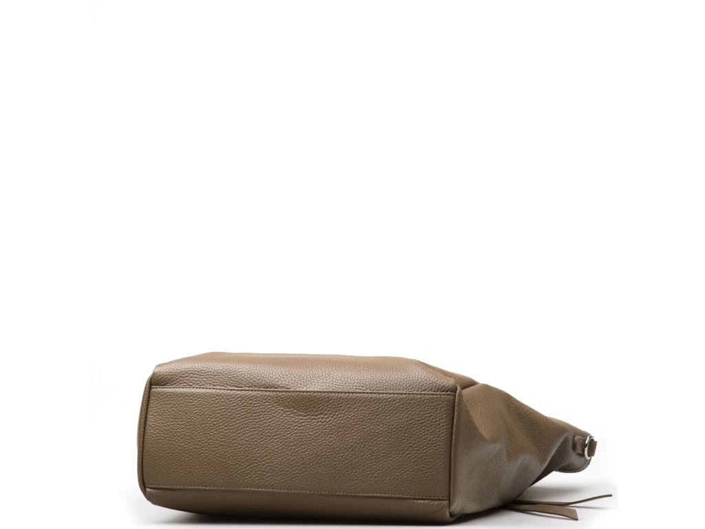 Kožená kabelka pro volný čas vr fango barvě. Interiér kabelky disponuje třemi kapsami, přičemž jedna je uzavíratelná zipem. Kabelka má i malé boční kapsy. Součástí kabelky je přídavný popruh s karabinami. Kabelku lze nosit se zapnutými cvoky po bocích v hranatém tvaru nebo bez cvoku v rozšířeném tvaru v horní části. Kabelka se uzavírá zipem a cvokem.