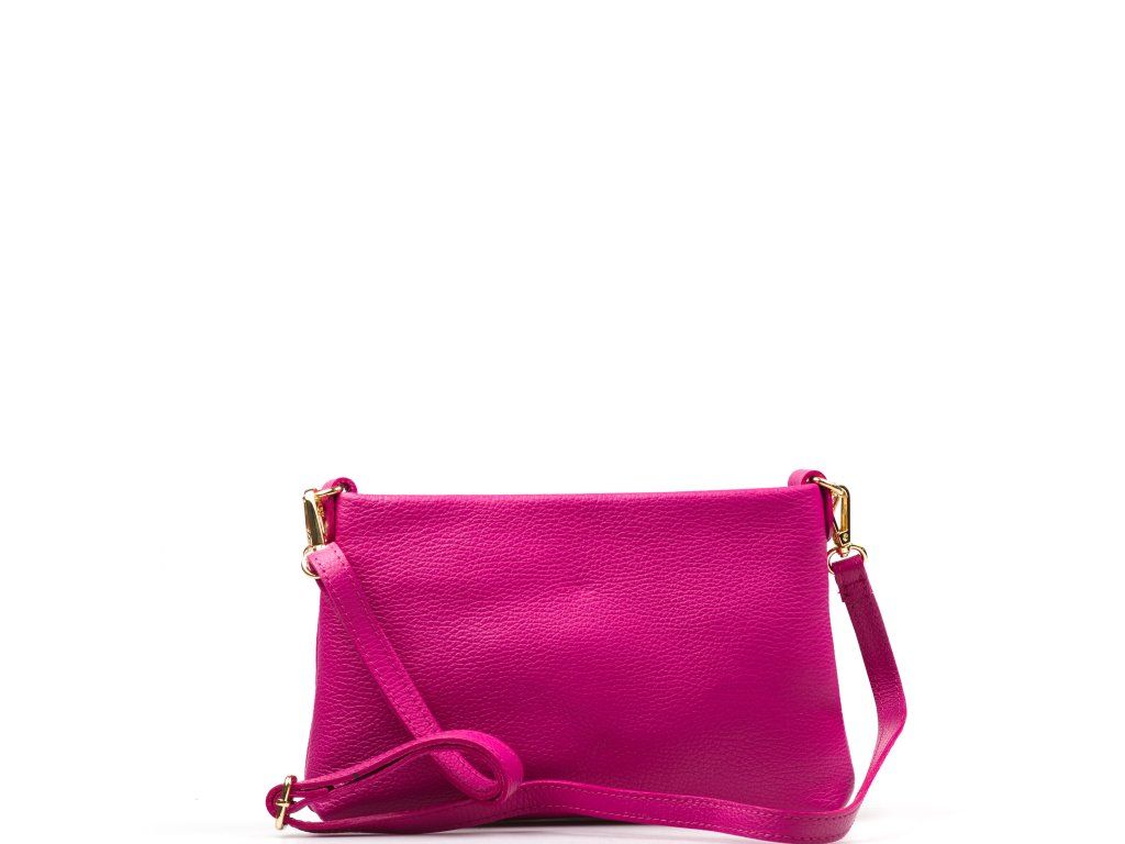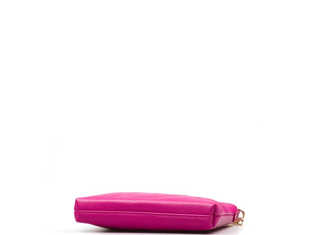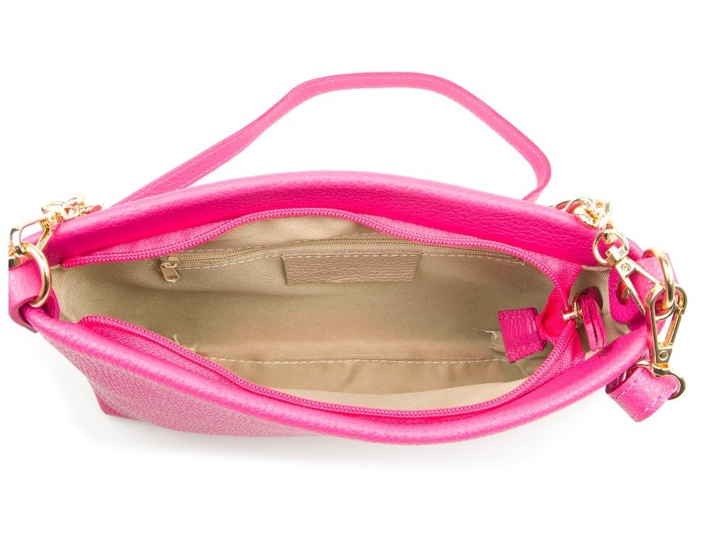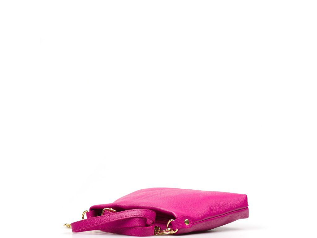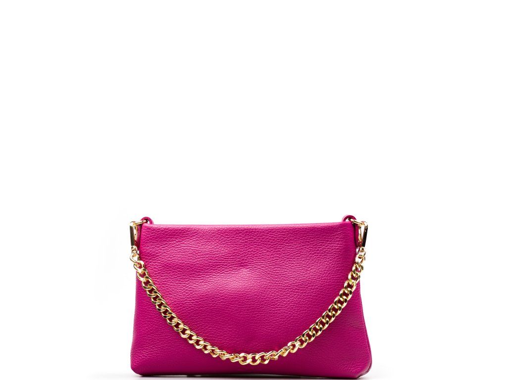 Kožená crossbody kabelka s řetízkovým popruhem ve fuchsiové barvě. Kabelka má dva odnímatelné popruhy, jeden krátký řetízkový a jeden dlouhý kožený. Interiér kabelky má k dispozici jednu hlavní úložnou kapsu a malou boční. Kabelka se uzavírá zipem.