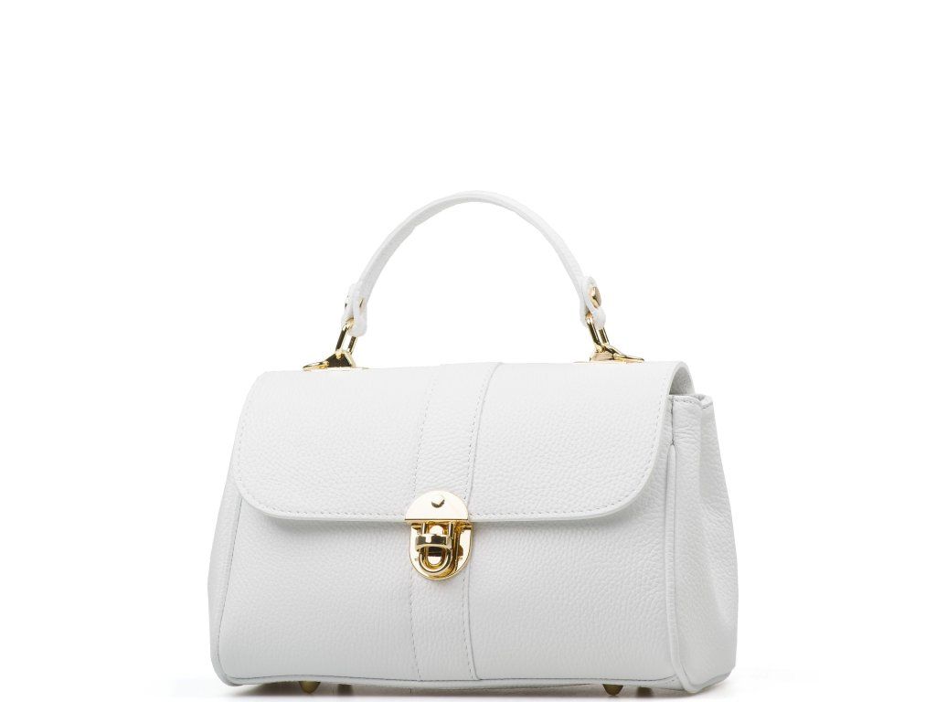 Kožená kabelka do ruky v bílé barvě. Interiér kabelky má k dispozici dvě úložné kapsy, uzavíratelné zipem. Kabelku můžete nosit v ruce či přes tělo, pomocí přídavného řetízkového popruhu. Kabelku zdobí zlaté kování na klopě. Kabelka je uzavíratelná klopou.
