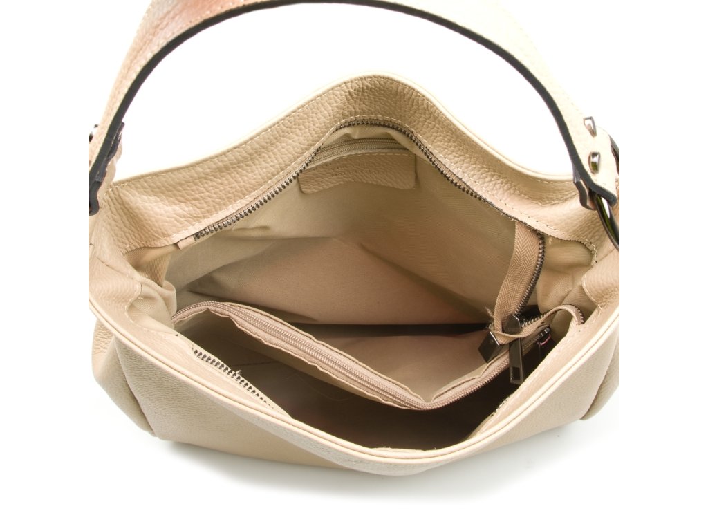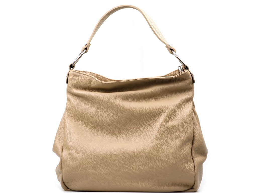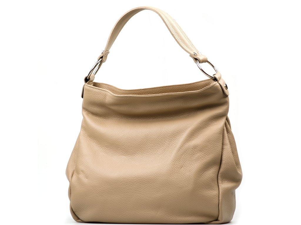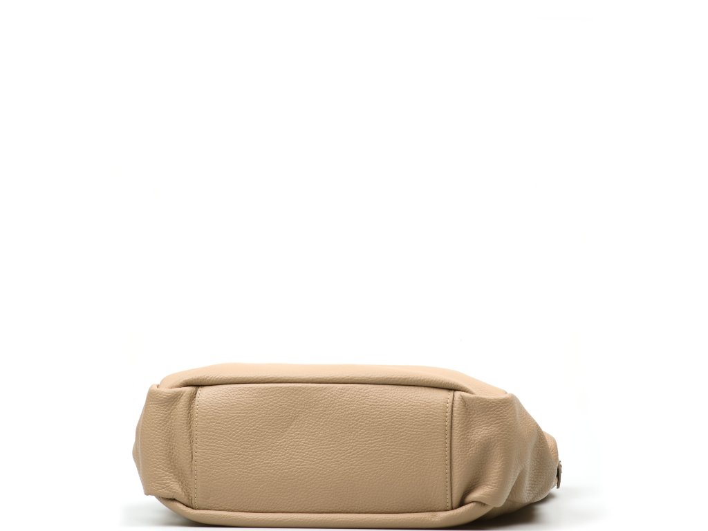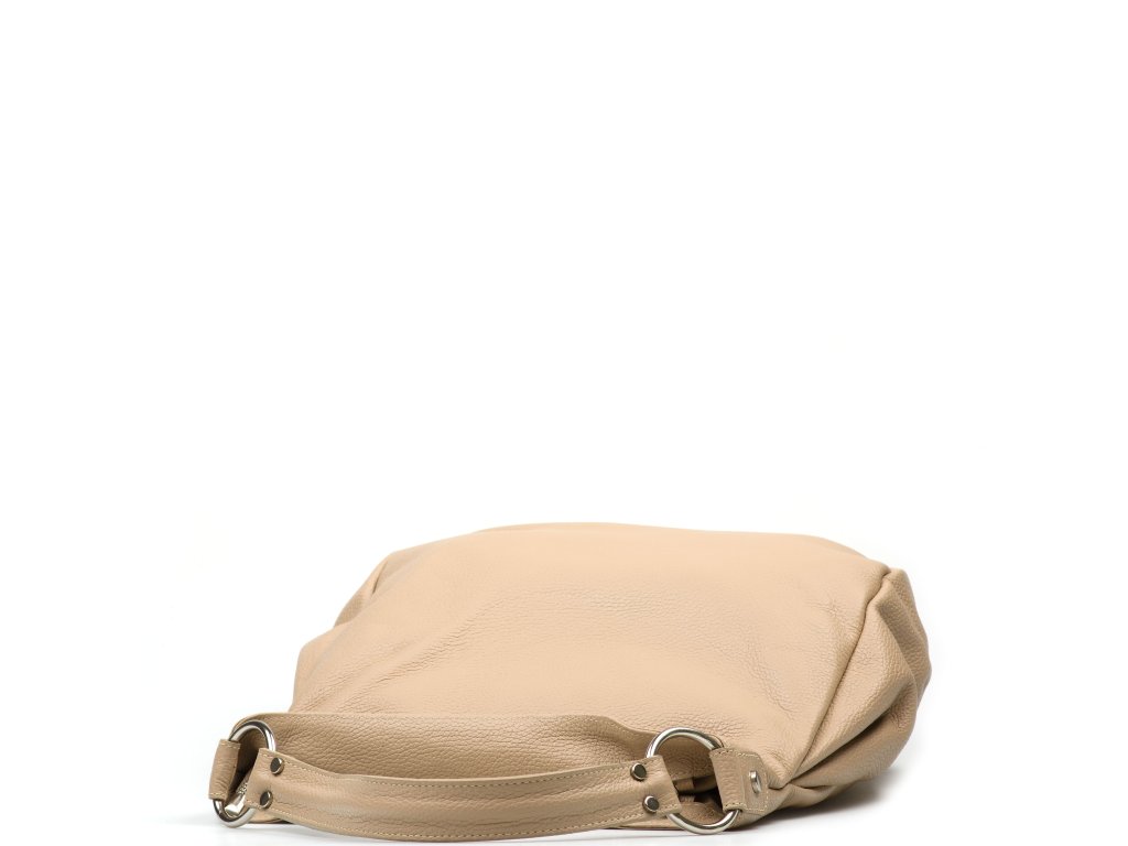 Kožená kabelka přes rameno pro volný čas v béžové barvě. Ucho kabelky je zavěšené na velkých kroužcích. Součástí kabelky je přídavný popruh s karabinami. Zadní strana kabelky je vybavená malou funkční kapsou na zip. Interiér kabelky má k dispozici tři úložné kapsy, uprostřed na zip a jednu malou kapsičku na vnitřní boční straně. Kabelka se uzavírá zipem.
