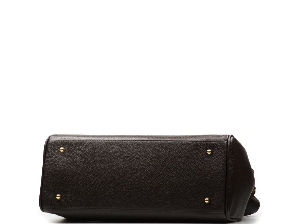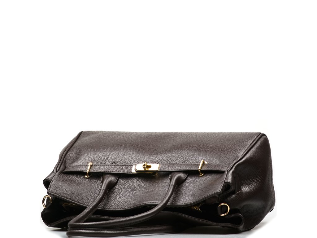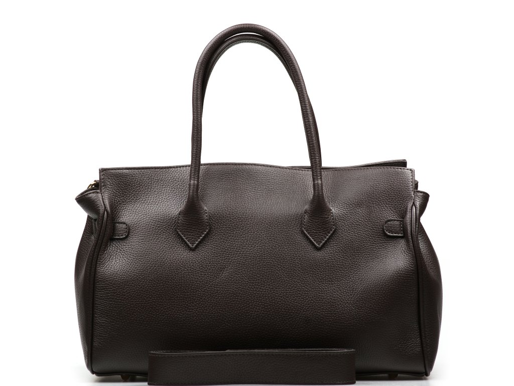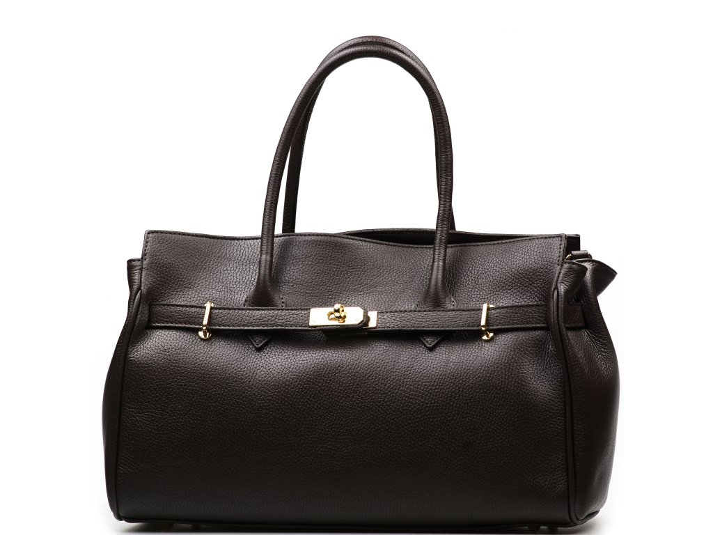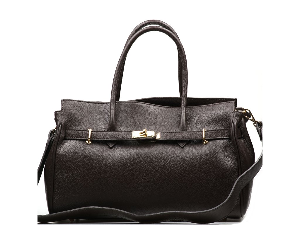 Kožená kabelka do ruky i přes rameno v tmavě hnědé barvě. Interiér kabelky disponuje třemi kapsami, přičemž jedna je uzavíratelná zipem. Kabelka má i malé boční kapsy. Součástí kabelky je přídavný popruh s karabinami. Horní část kabelky zdobí kožený popruh se zlatými sponami.