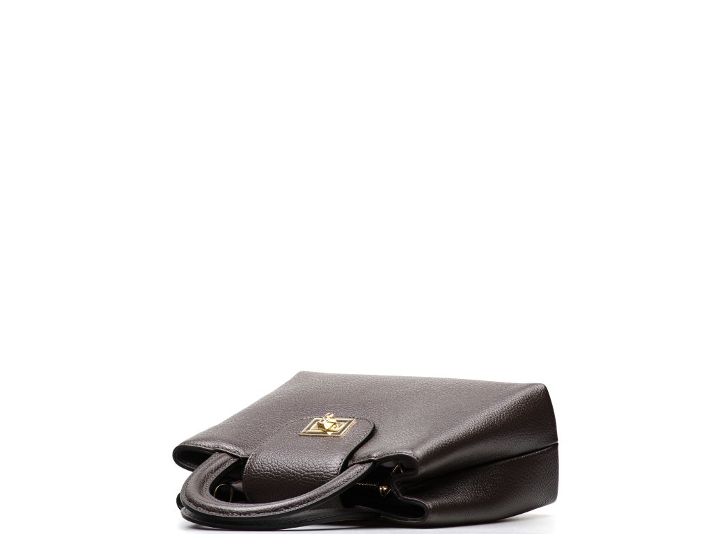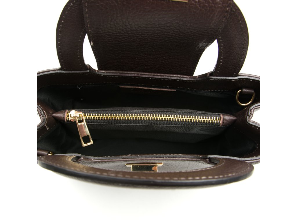 Minimalistická kožená kabelka v tmavě hnědé barvě. Interiér kabelky disponuje třemi hlavními kapsami, přičemž prostřední je uzavíratelná zipem. Kabelku můžete nosit v ruce či přes rameno, díky nastavitelnému přídavného popruhu. Kabelku zdobí zlaté kování, kterým se kabelka zapíná. Kabelka je uzavíratelná klopou.