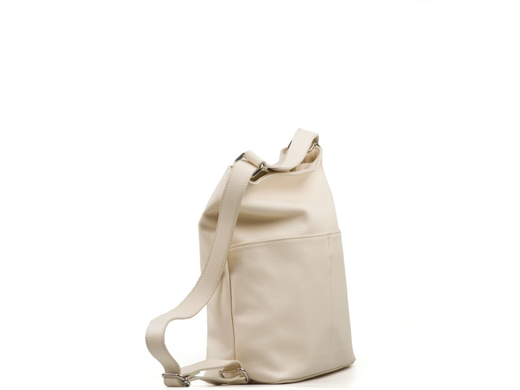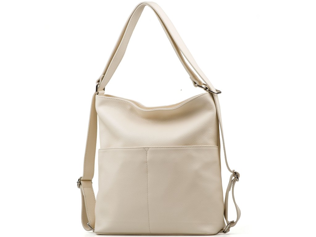 Dámská kožená kabelka v béžové barvě, která se během chvíle promění v batůžek – ideální, když chcete mít volné ruce, ale nechcete dělat kompromisy ve stylu. Díky nastavitelnému popruhu si ji snadno prodloužíte nebo zkrátíte přesně podle potřeby. Na přední straně najdete dvě praktické kapsy na cvok pro věci, které potřebujete mít rychle po ruce (např. telefon, kapesníčky nebo klíče). Uvnitř kabelka nabízí tři úložné kapsy, z nichž jedna je uzavíratelná zipem pro bezpečné uložení cenností. Hlavní prostor se zapíná na zip, takže obsah zůstane spolehlivě chráněný i na cestách.