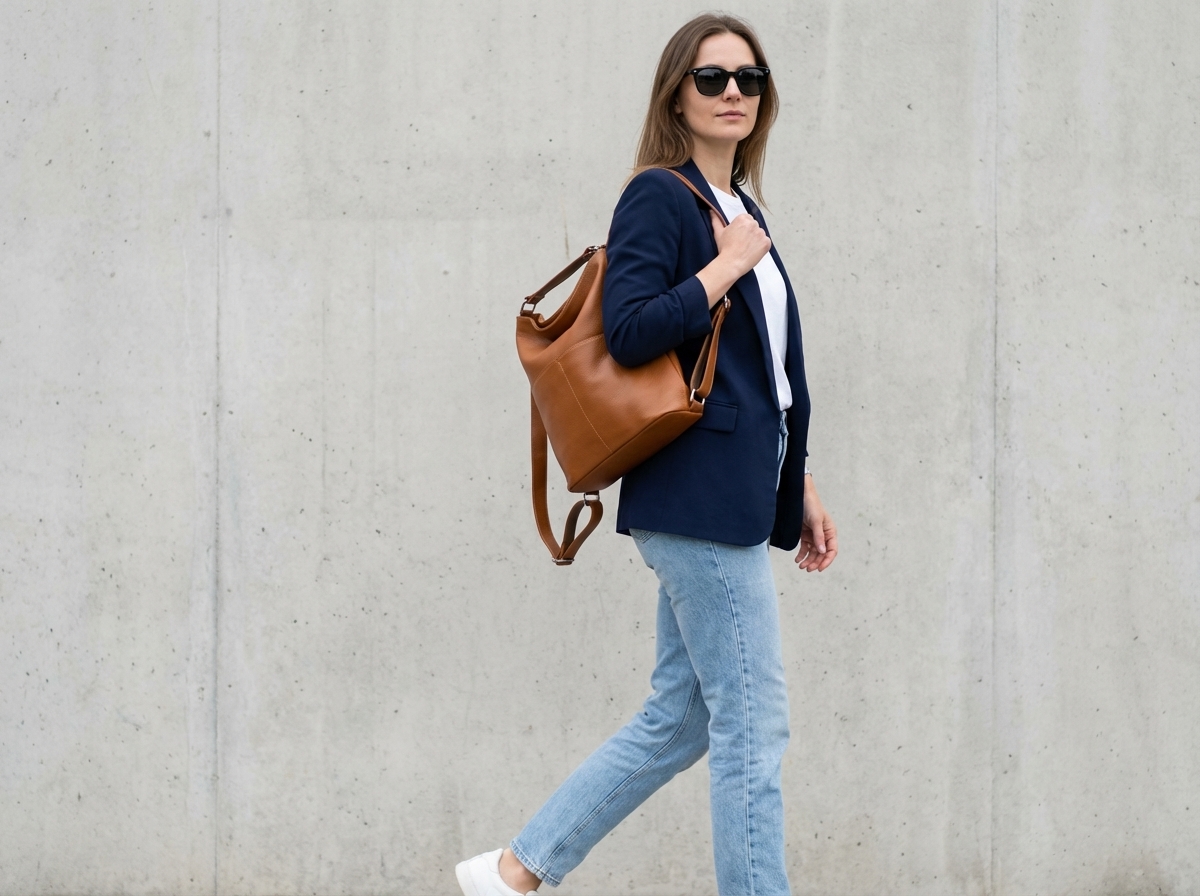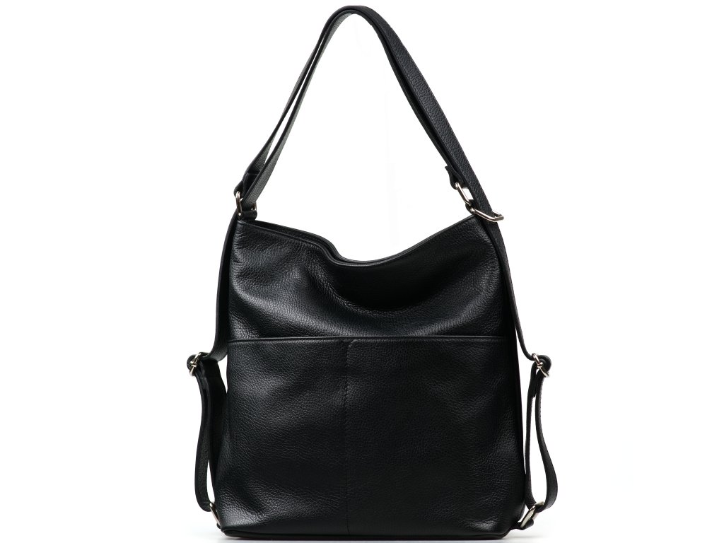Dámská kožená kabelka v černé barvě, která se během chvíle promění v batůžek – ideální, když chcete mít volné ruce, ale nechcete dělat kompromisy ve stylu. Díky nastavitelnému popruhu si ji snadno prodloužíte nebo zkrátíte přesně podle potřeby. Na přední straně najdete dvě praktické kapsy na cvok pro věci, které potřebujete mít rychle po ruce (např. telefon, kapesníčky nebo klíče). Uvnitř kabelka nabízí tři úložné kapsy, z nichž jedna je uzavíratelná zipem pro bezpečné uložení cenností. Hlavní prostor se zapíná na zip, takže obsah zůstane spolehlivě chráněný i na cestách.