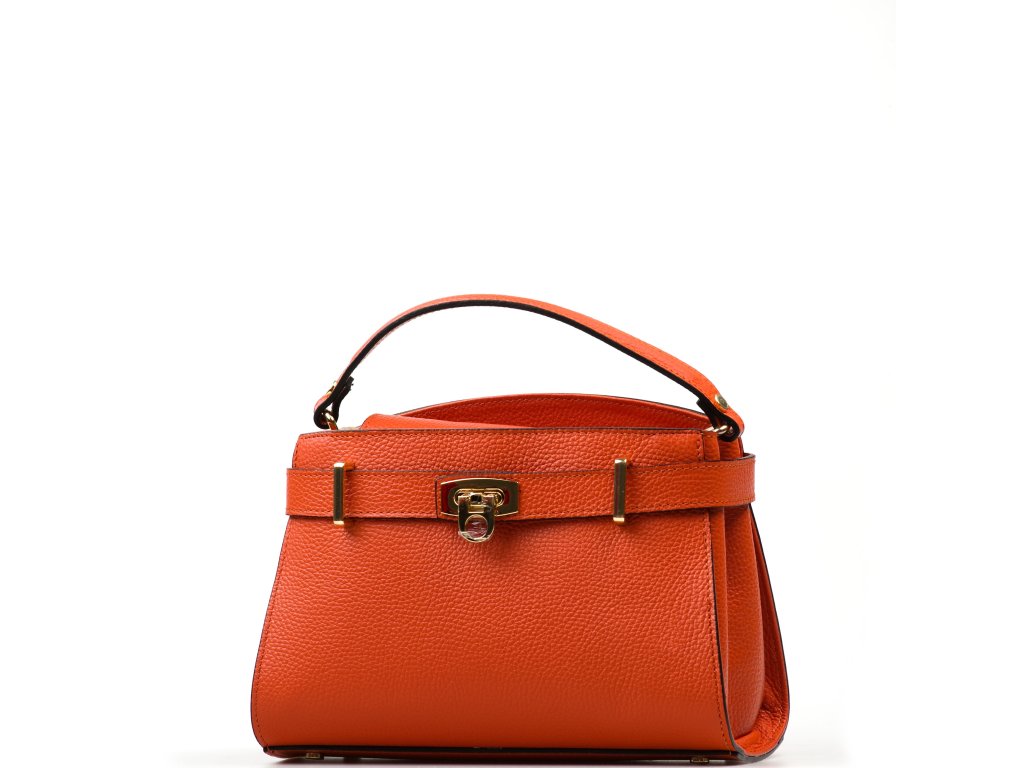 Minimalistická kožená kabelka v oranžové barvě. Interiér kabelky disponuje jednou hlavní kapsou a jednou malou zadní, která je uzavíratelná zipem. Kabelku můžete nosit v ruce či přes rameno. Kabelku zdobí zlaté kování, kterým se kabelka zapíná. Kabelka je uzavíratelná zipem a klopou.