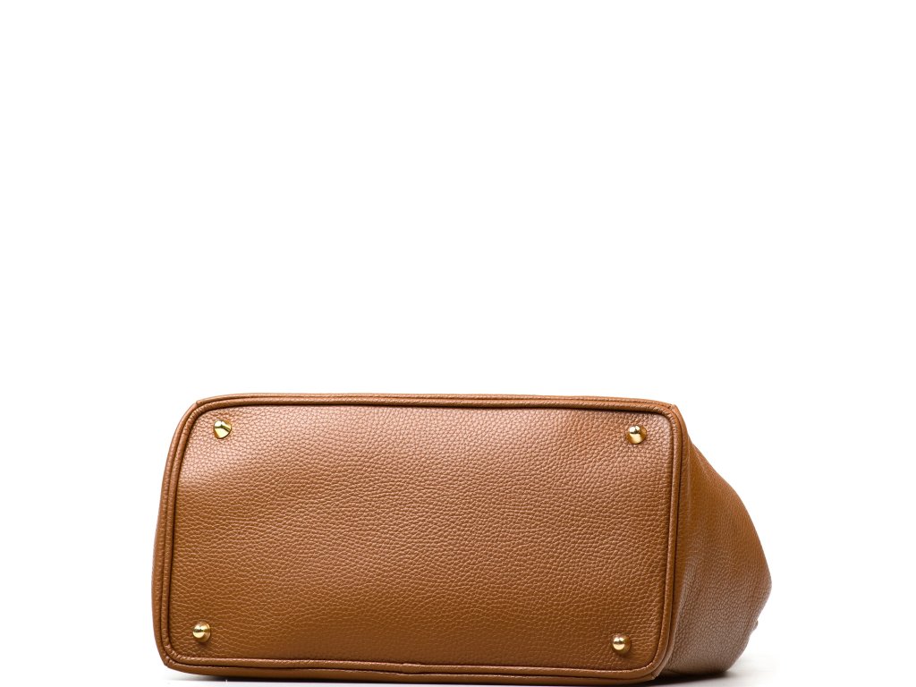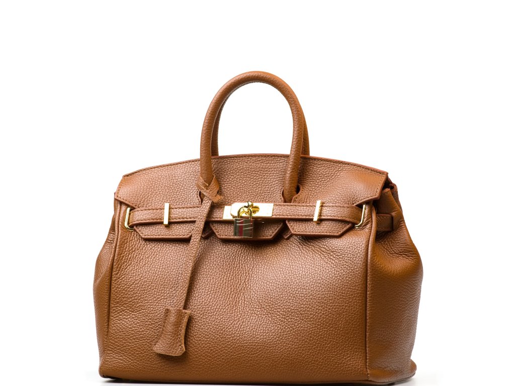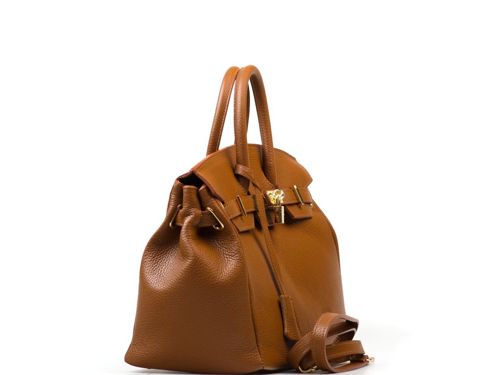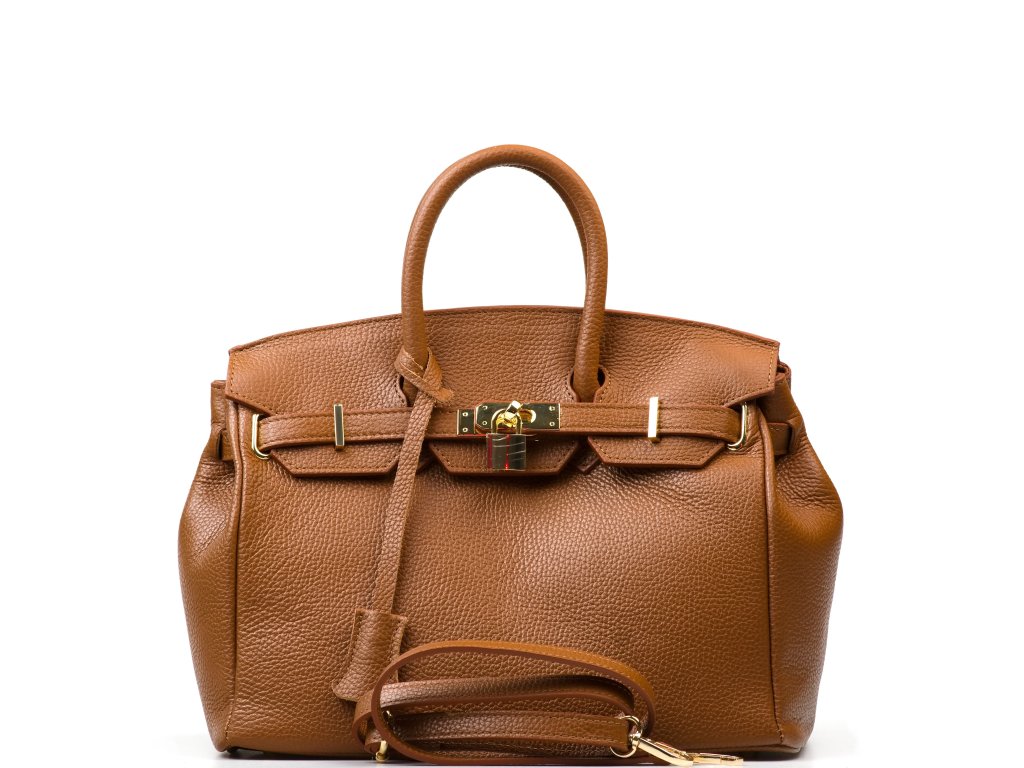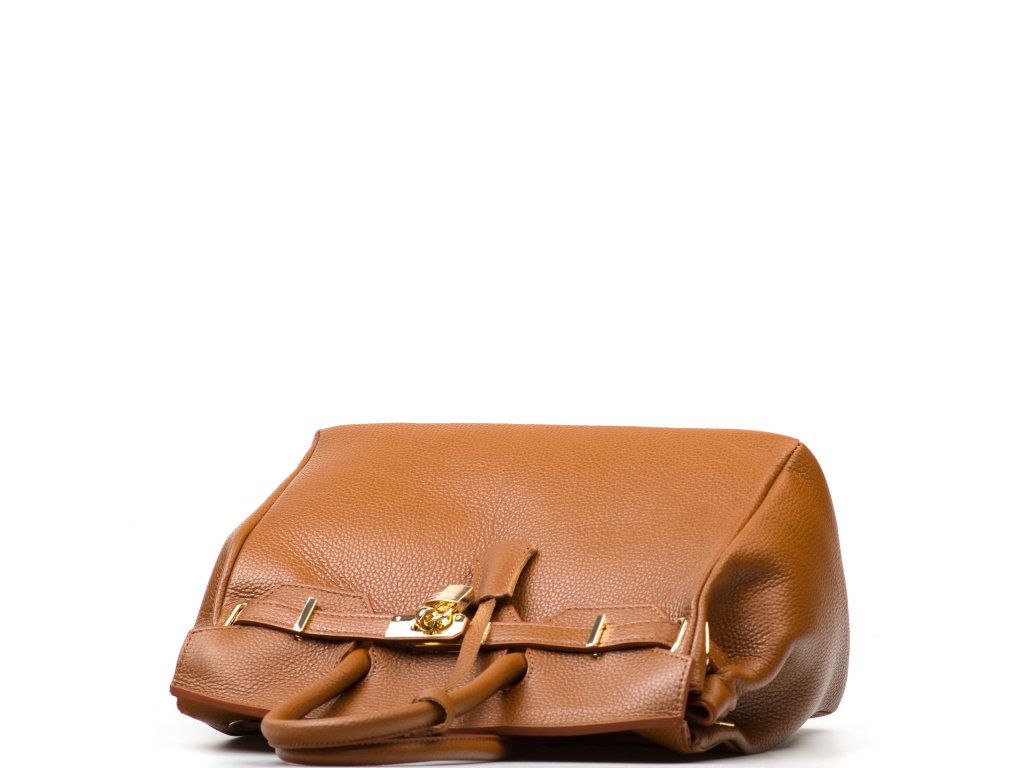 Kožená kabelka v koňakově hnědé barvě, kterou můžete nosit elegantně v ruce i pohodlně přes rameno. Uvnitř nabízí jednu hlavní úložnou kapsu na vše podstatné a jednu menší boční kapsičku na drobnosti, které chcete mít hned po ruce. Horní část zdobí kožený popruh se zlatými sponami, který kabelce dodává výrazný, nadčasový detail. Kabelka se uzavírá klopou se zámkem, takže vaše věci zůstanou bezpečně uložené i na cestách.