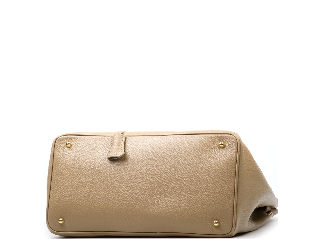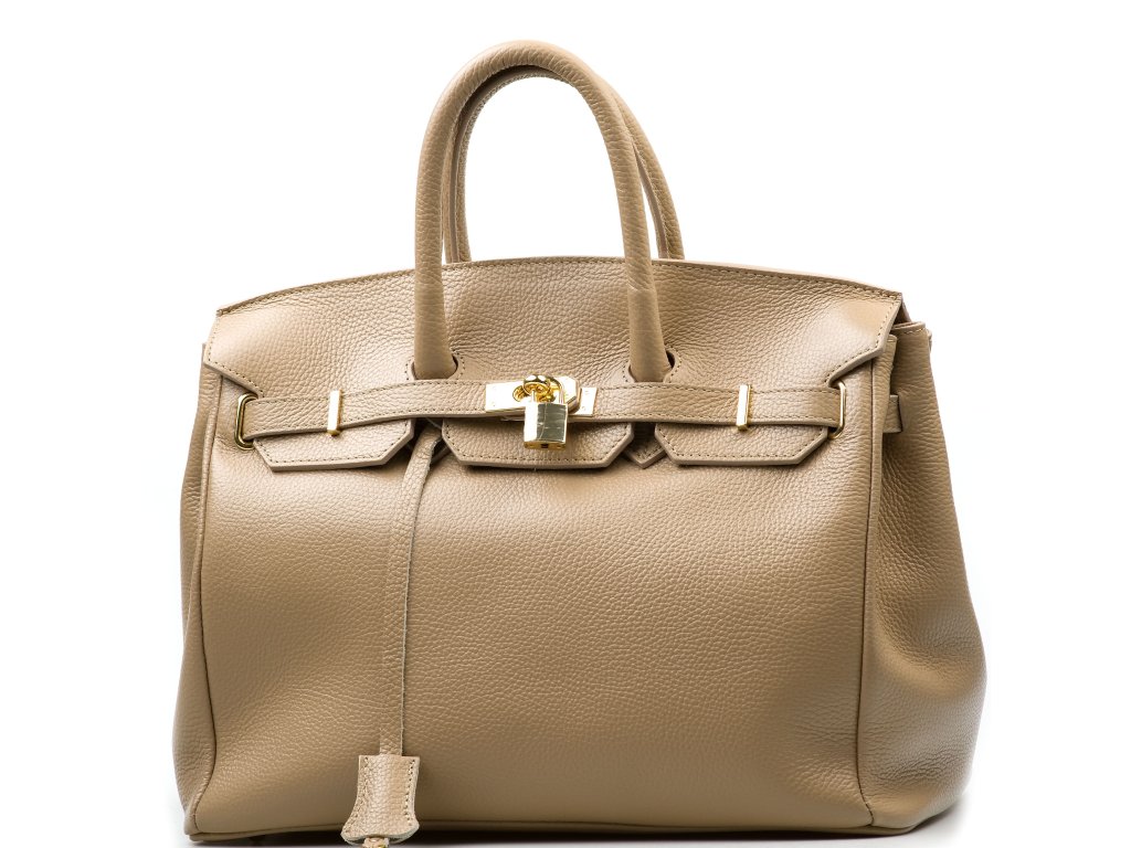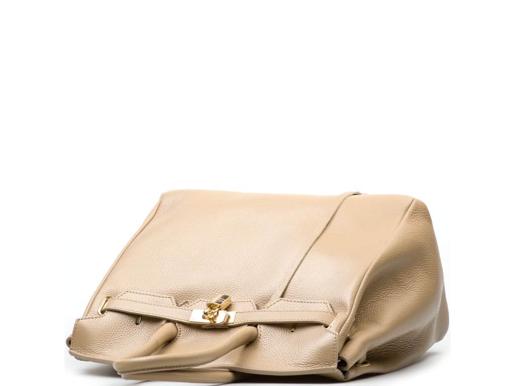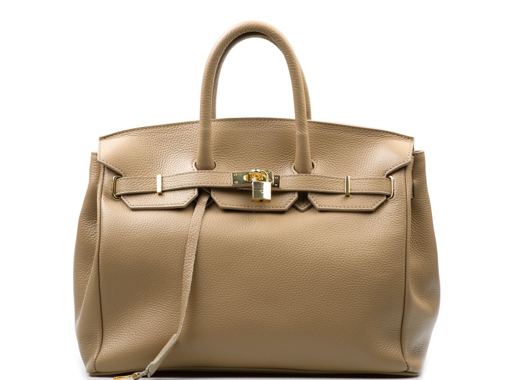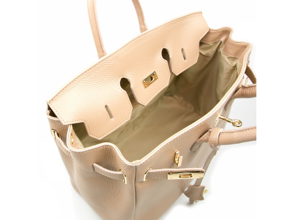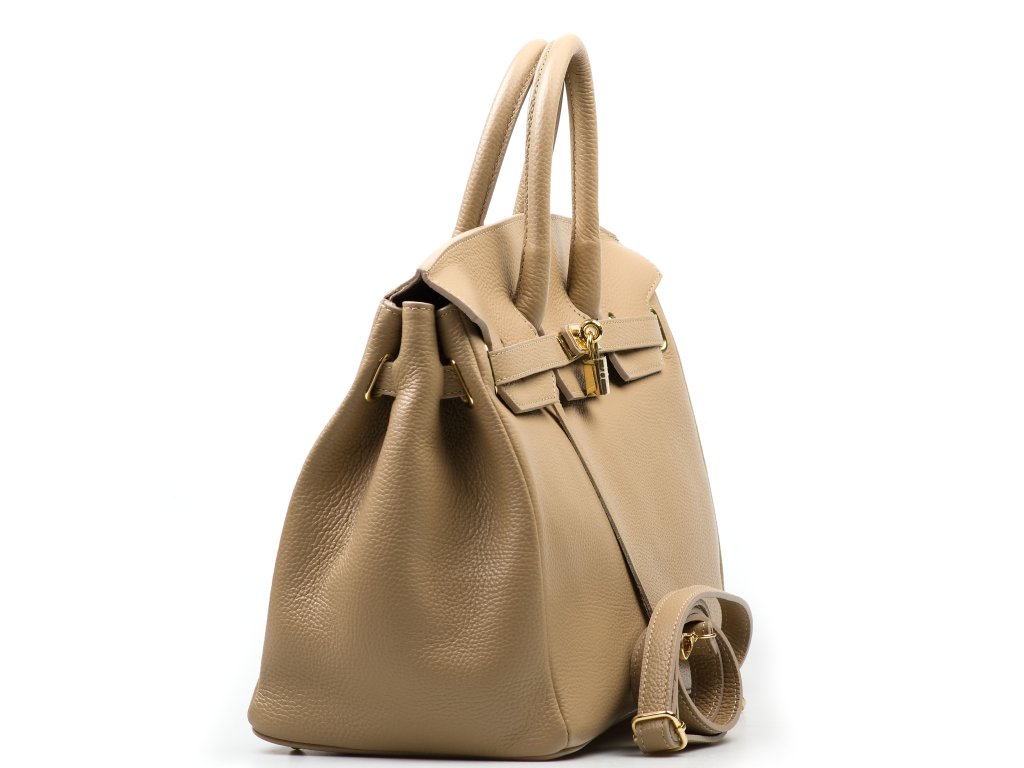 Kožená kabelka do ruky i přes rameno v taupe barvě. Interiér kabelky disponuje jednou hlavní úložnou kapsou a jednou malou boční. Horní část kabelky zdobí kožený popruh se zlatými sponami. Kabelka se uzavírá pomocí klopy se zámkem.