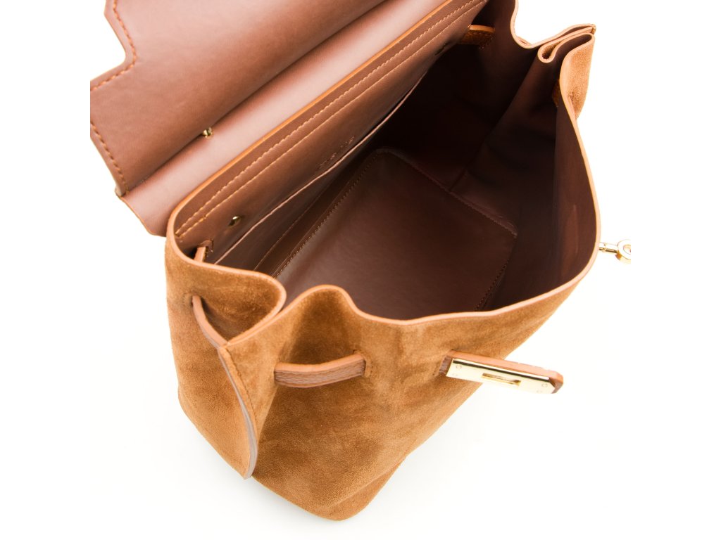 Minimalistická semišová kabelka v koňakově hnědé barvě je dokonalým spojením jednoduchosti a stylu. Její interiér nabízí jednu prostornou hlavní kapsu a menší zadní kapsu na zip pro bezpečné uložení drobností. Kabelku lze nosit v ruce i přes rameno, takže se skvěle přizpůsobí každé příležitosti. Zlaté kování, kterým se kabelka zapíná, jí dodává sofistikovaný vzhled. Kabelka se uzavírá zipem a klopou, což zajišťuje nejen eleganci, ale i bezpečnost všech uložených věcí.