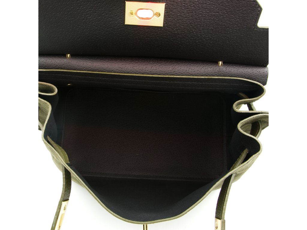 Minimalistická semišová kabelka v olivově zelené barvě je dokonalým spojením jednoduchosti a stylu. Její interiér nabízí jednu prostornou hlavní kapsu a menší zadní kapsu na zip pro bezpečné uložení drobností. Kabelku lze nosit v ruce i přes rameno, takže se skvěle přizpůsobí každé příležitosti. Zlaté kování, kterým se kabelka zapíná, jí dodává sofistikovaný vzhled. Kabelka se uzavírá zipem a klopou, což zajišťuje nejen eleganci, ale i bezpečnost všech uložených věcí.