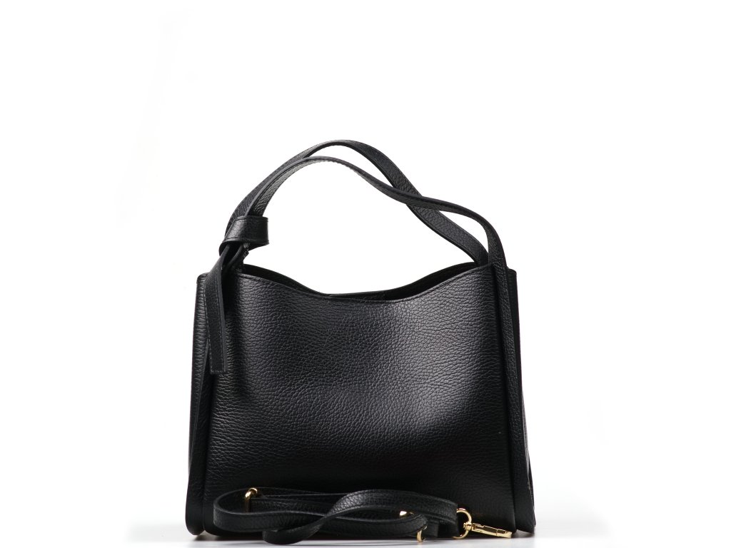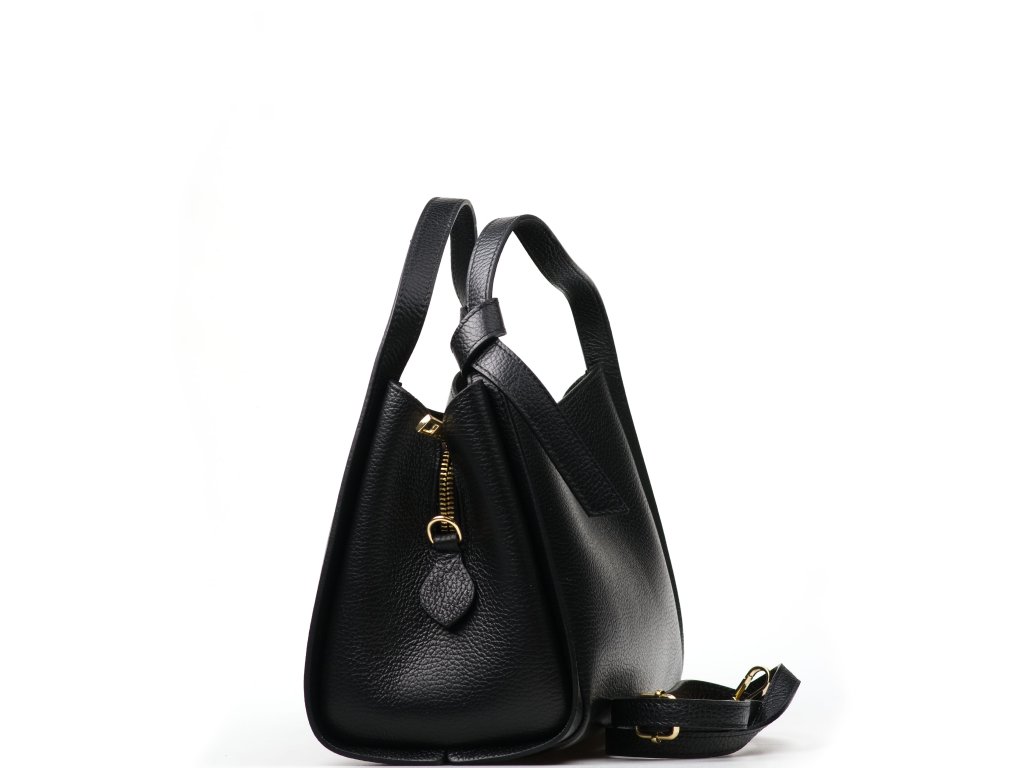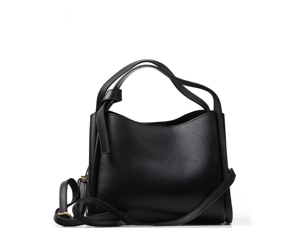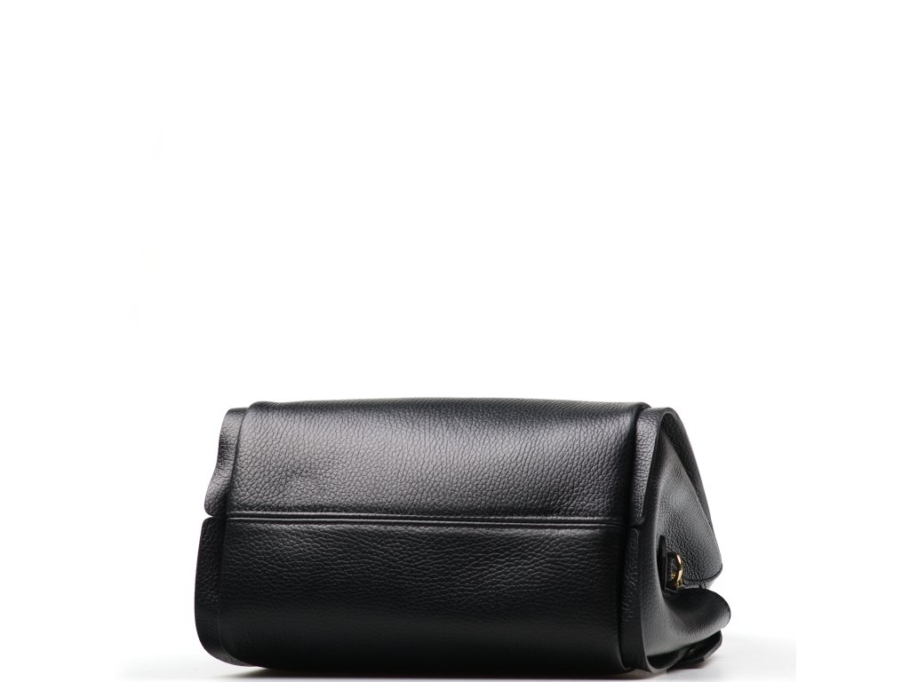 Minimalistická černá kožená kabelka se zlatým kováním pro elegantní každodenní nošení. Uvnitř nabízí tři hlavní přihrádky, přičemž prostřední je na zip – ideální na cennosti. Nosit ji můžete v ruce i přes rameno díky nastavitelnému přídavnému popruhu. Kabelka se uzavírá klopou se zapínáním na kování.