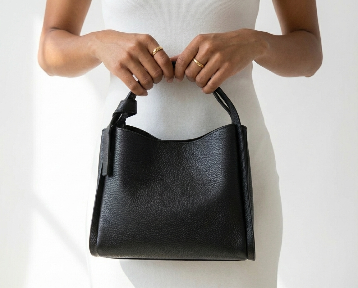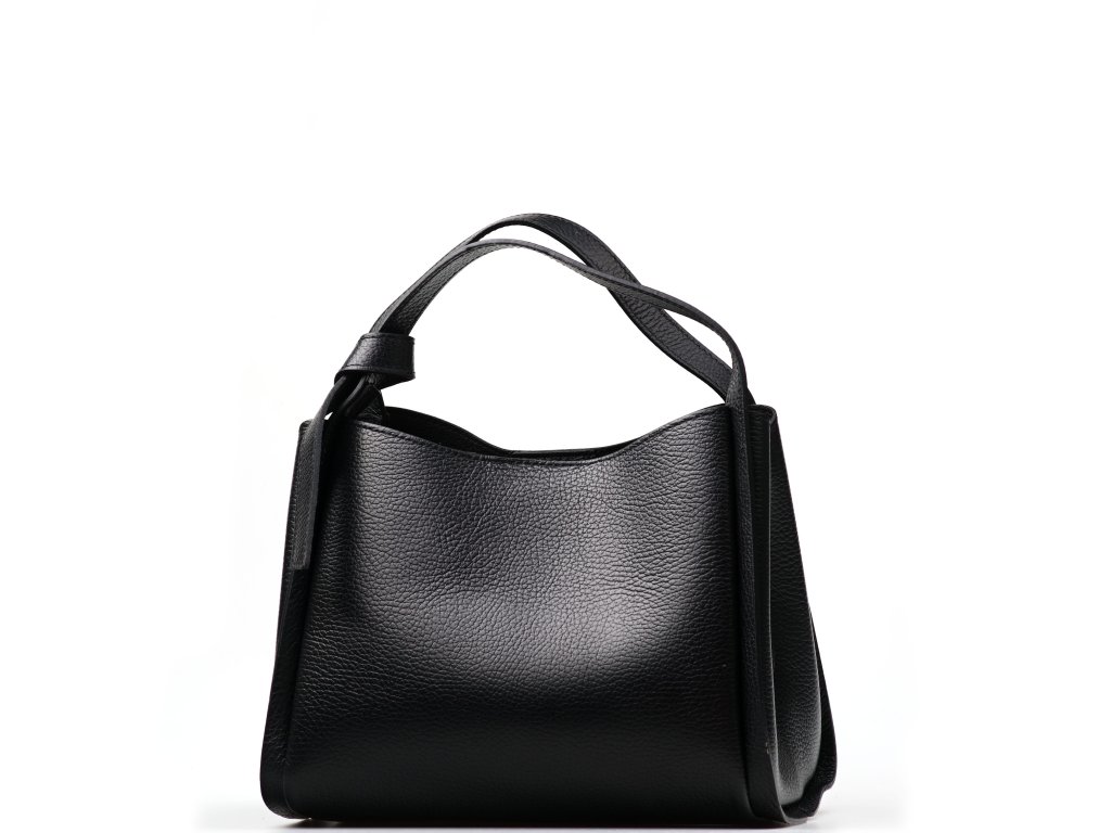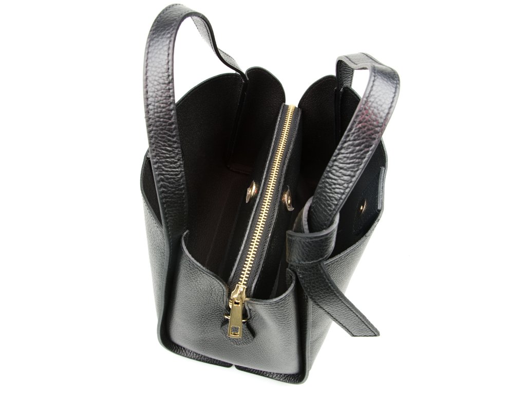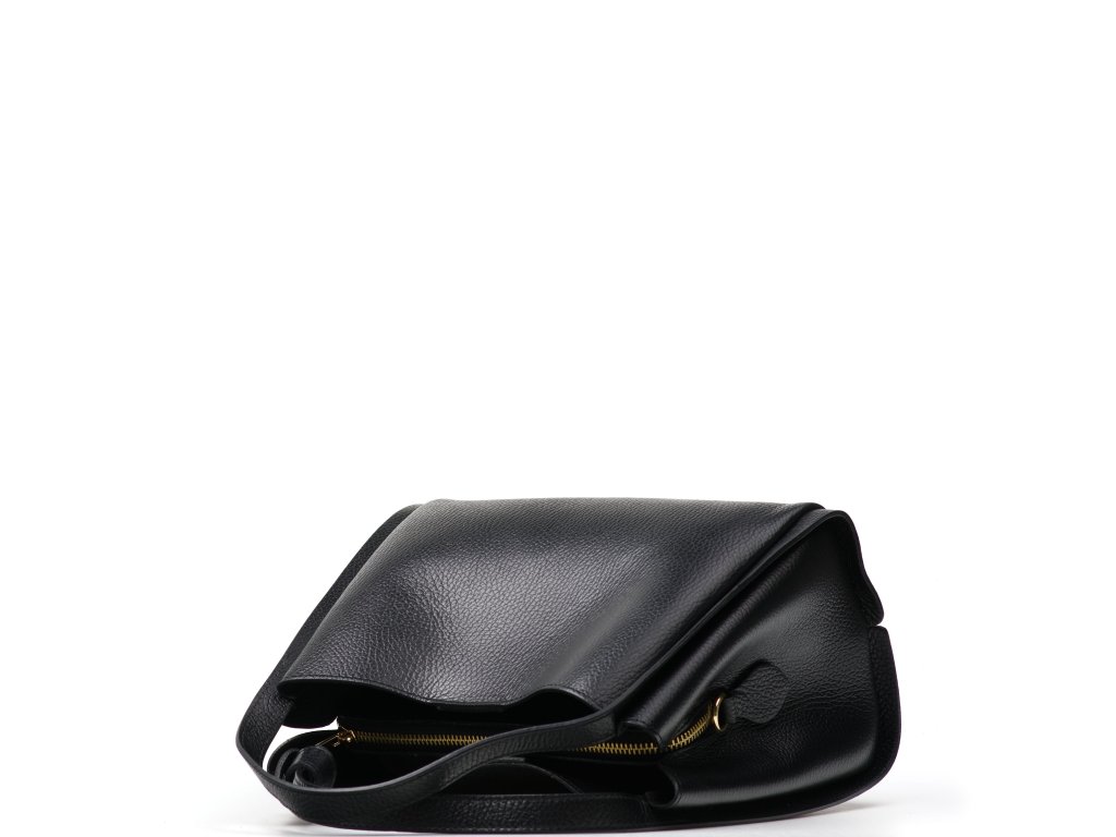 Minimalistická černá kožená kabelka se zlatým kováním pro elegantní každodenní nošení. Uvnitř nabízí tři hlavní přihrádky, přičemž prostřední je na zip – ideální na cennosti. Nosit ji můžete v ruce i přes rameno díky nastavitelnému přídavnému popruhu. Kabelka se uzavírá klopou se zapínáním na kování.
